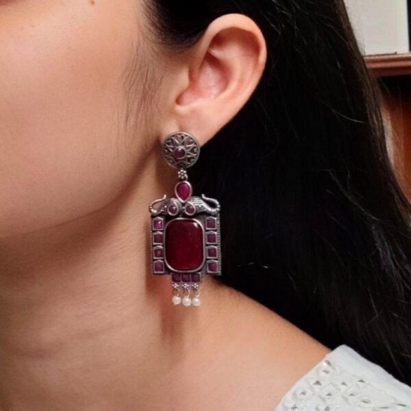 Traditional Elephant Earrings | Silver Replica Oxidized Dangler with Beautiful Monalisa Stone Jewelry