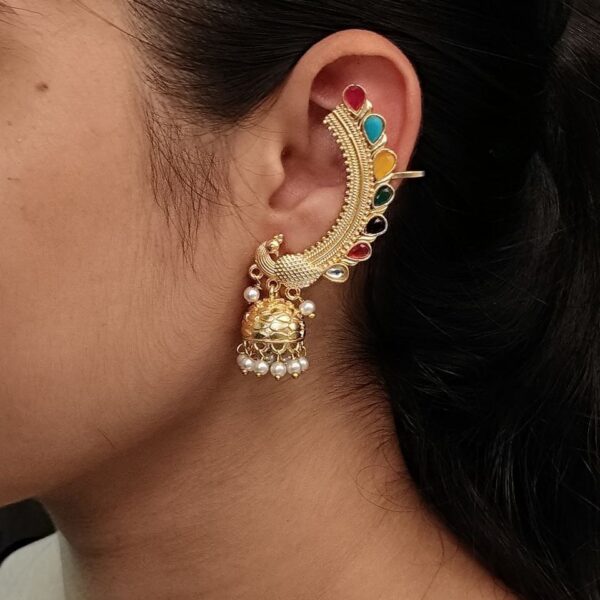 Traditional Gold Plated Beautiful Peacock Jhumki Earcuff | Stone & Pearl Detailing Ethnic Jewelry