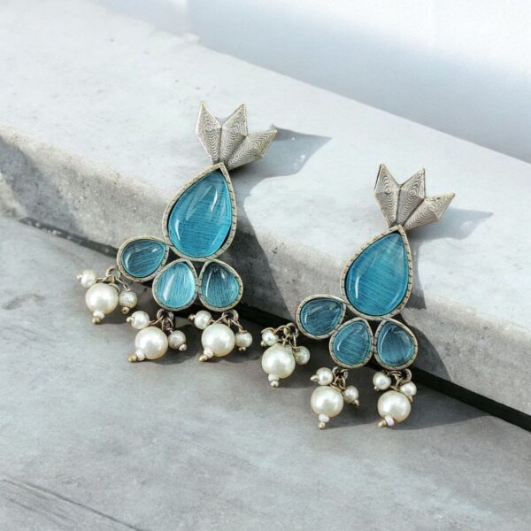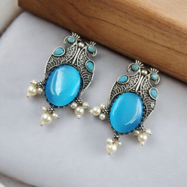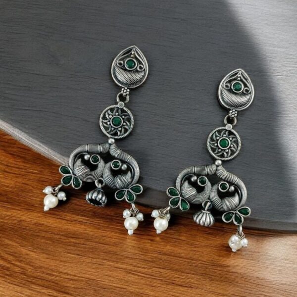 Antique Silver Peacock Style Earrings with Monalisa Stone & Pearl Beads