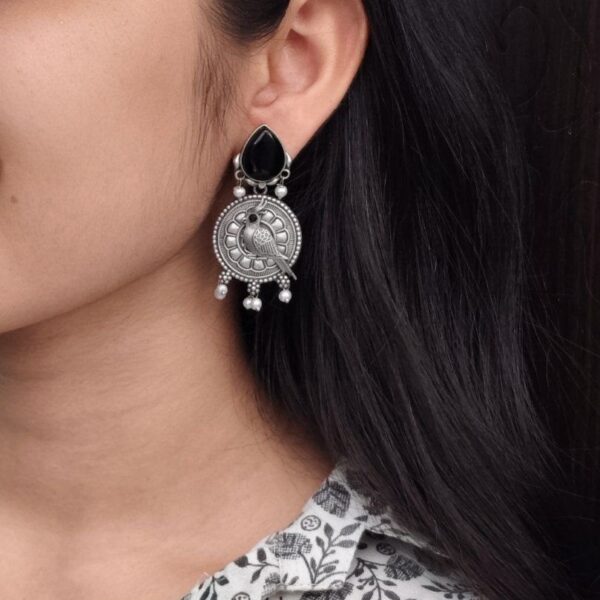 Beautiful Bird Design Earrings | Oxidized Silver Replica Stone & Pearl Work Dangler Jewelry