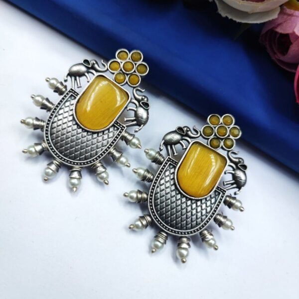 Designer Elephant Earrings With Monalisa Stone - Oxidised Silver Look aLike Earring