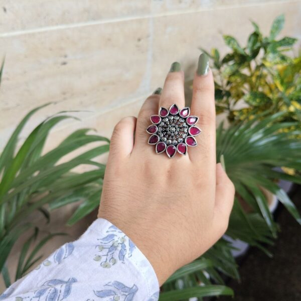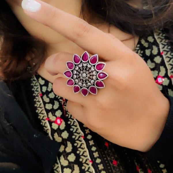 Silver Plated Flower Style Oxidised Stone Work Ring For Girls
