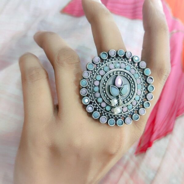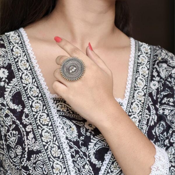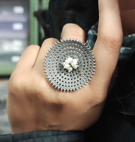 Ethnic Style Round Adjustable Oxidized Ring | Silver Replica Best Pearl Work Jewelry