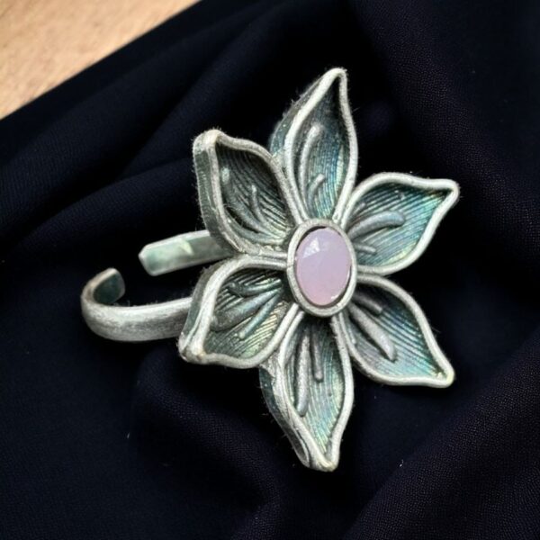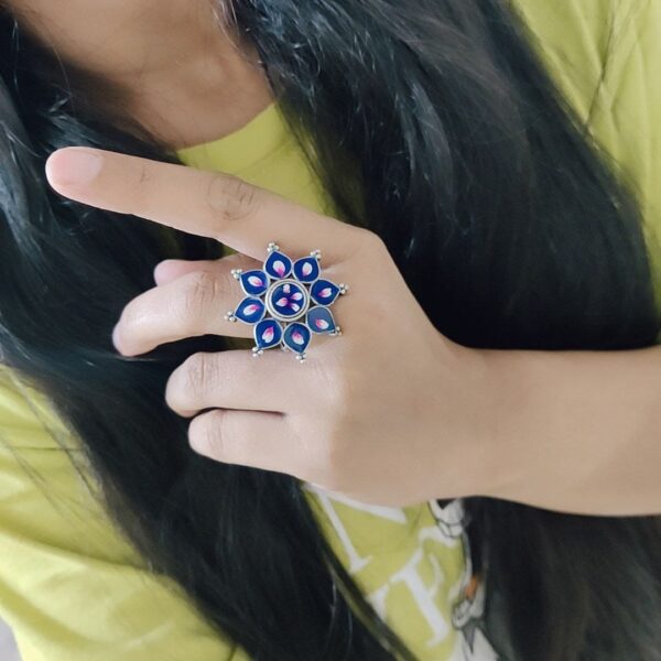 Oxidised Handpainted Flower Finger Ring Adjustable ? Unique Traditional Jewelry
