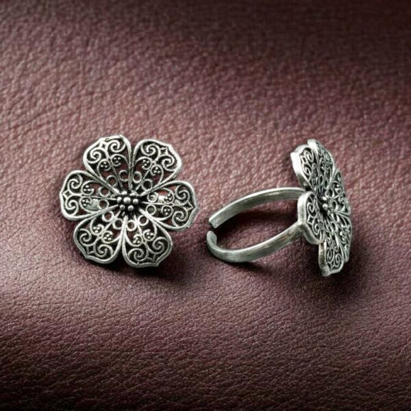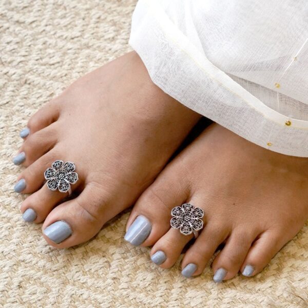 Designer Filigree Art Flower Oxidised Toe Rings for Vintage Look