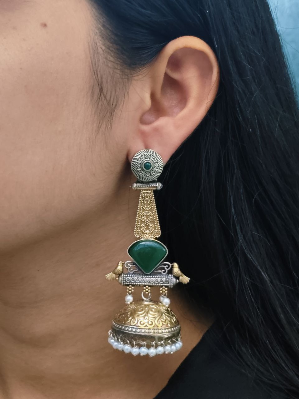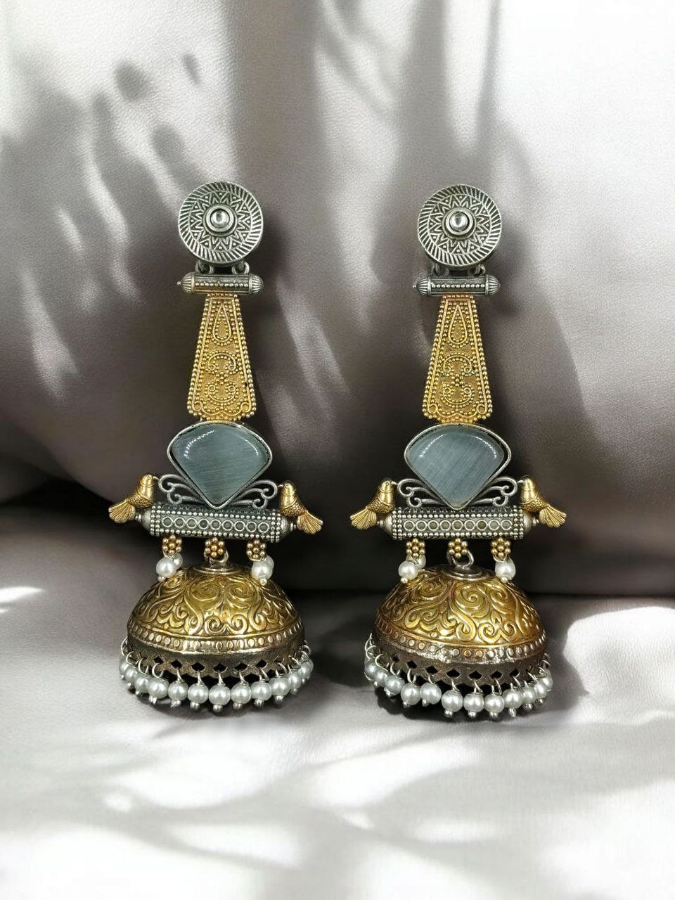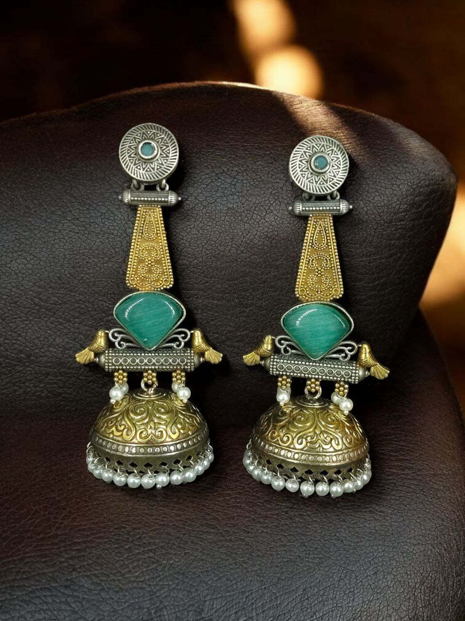 Crafted in premium-quality oxidized metal, these Two-Tone Jhumka Earrings not only exude elegance but are also skin-friendly and lightweight ? ensuring comfort for long hours of wear. The two-tone finish brings depth and contrast, making these Two-Tone Jhumka Earrings perfect for both traditional outfits and contemporary fusion wear.