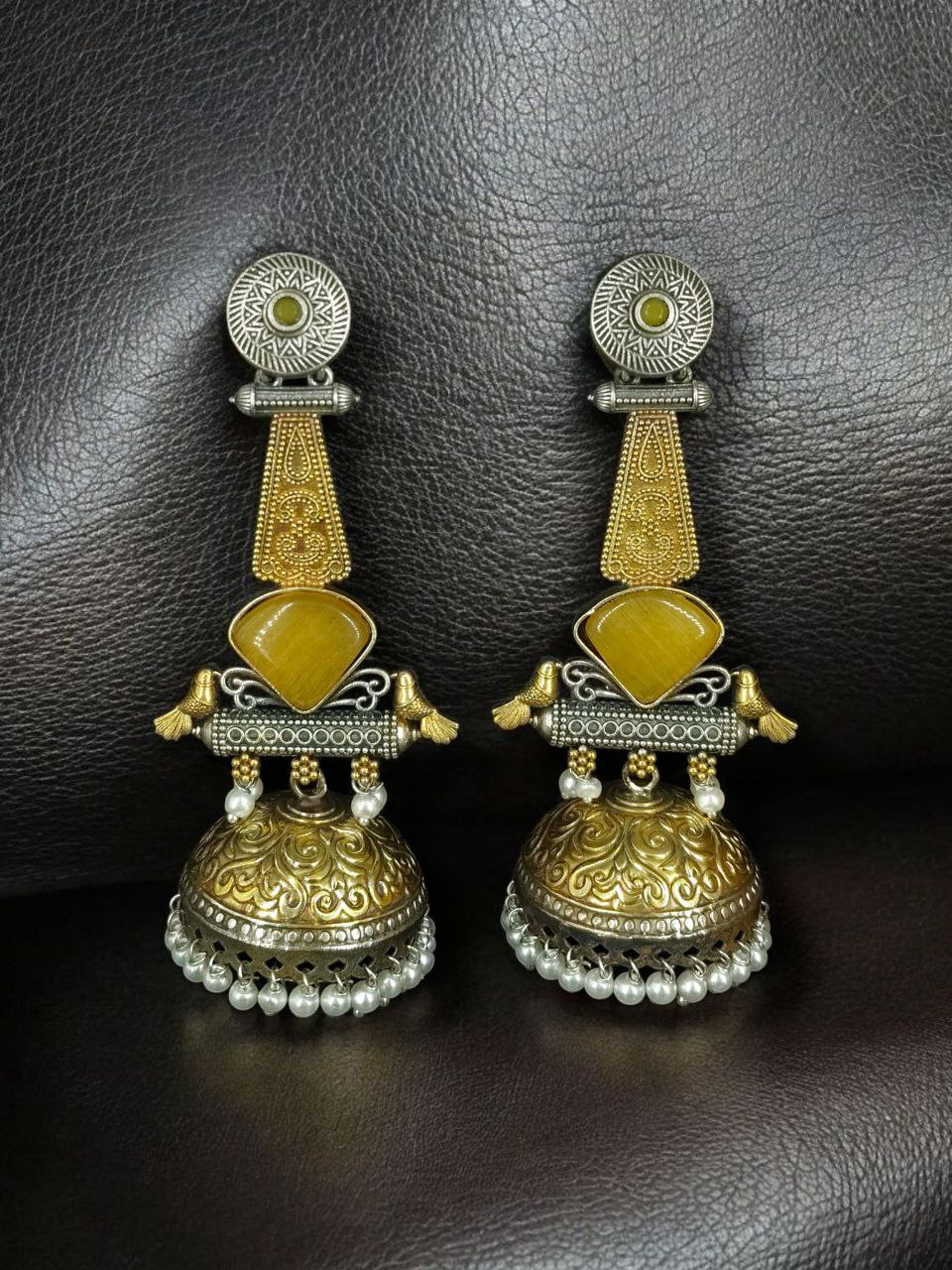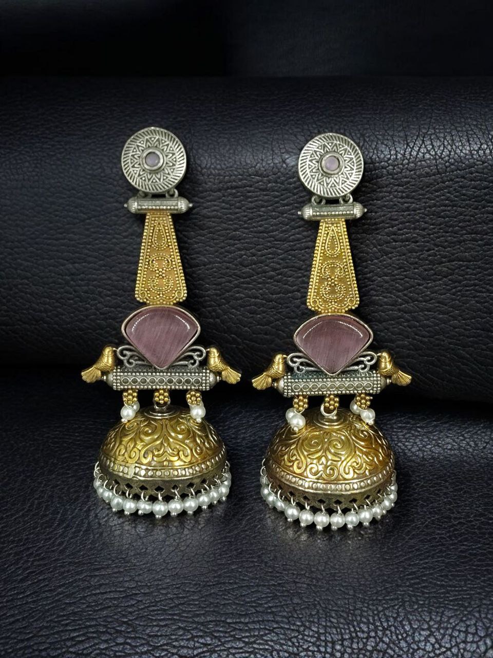 Step into a world of timeless charm with our Affordable Bird Design Two-Tone Jhumka Earrings, thoughtfully handcrafted to bring a traditional essence with a modern flair. Designed with intricate oxidized detailing and finished in a classic two-tone polish, these Two-Tone Jhumka Earrings are a statement piece for those who adore artistic ethnic jewelry.