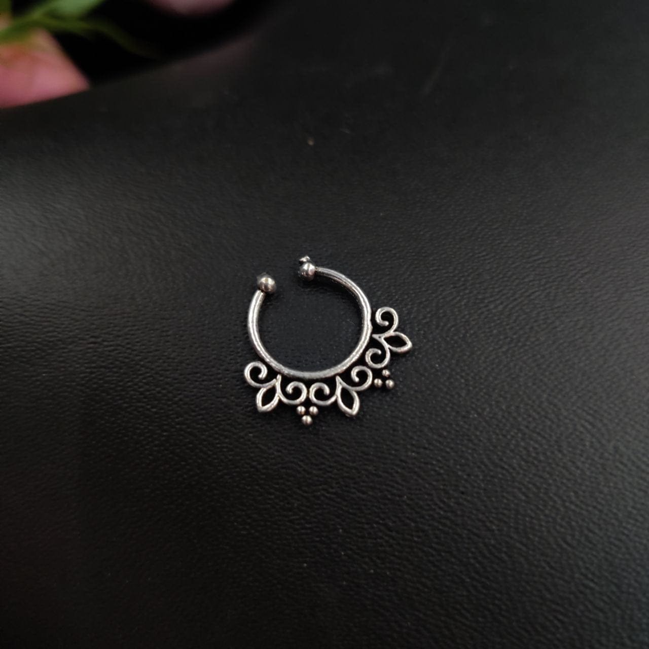 Our Affordable Silver Plated Oxidised Septum Floral Nose Jewelry are meticulously crafted with an eye-catching oxidized finish, imbuing each piece with a sense of vintage charm and sophistication. The intricate design features ornate patterns and detailing, adding a touch of allure to your ensemble. Whether you’re drawn to floral motifs, geometric shapes, or tribal-inspired patterns, our collection offers a diverse array of designs to suit your unique style preferences. Each nose ring is carefully crafted to ensure precision and quality, reflecting the artistry of traditional craftsmanship combined with contemporary flair.