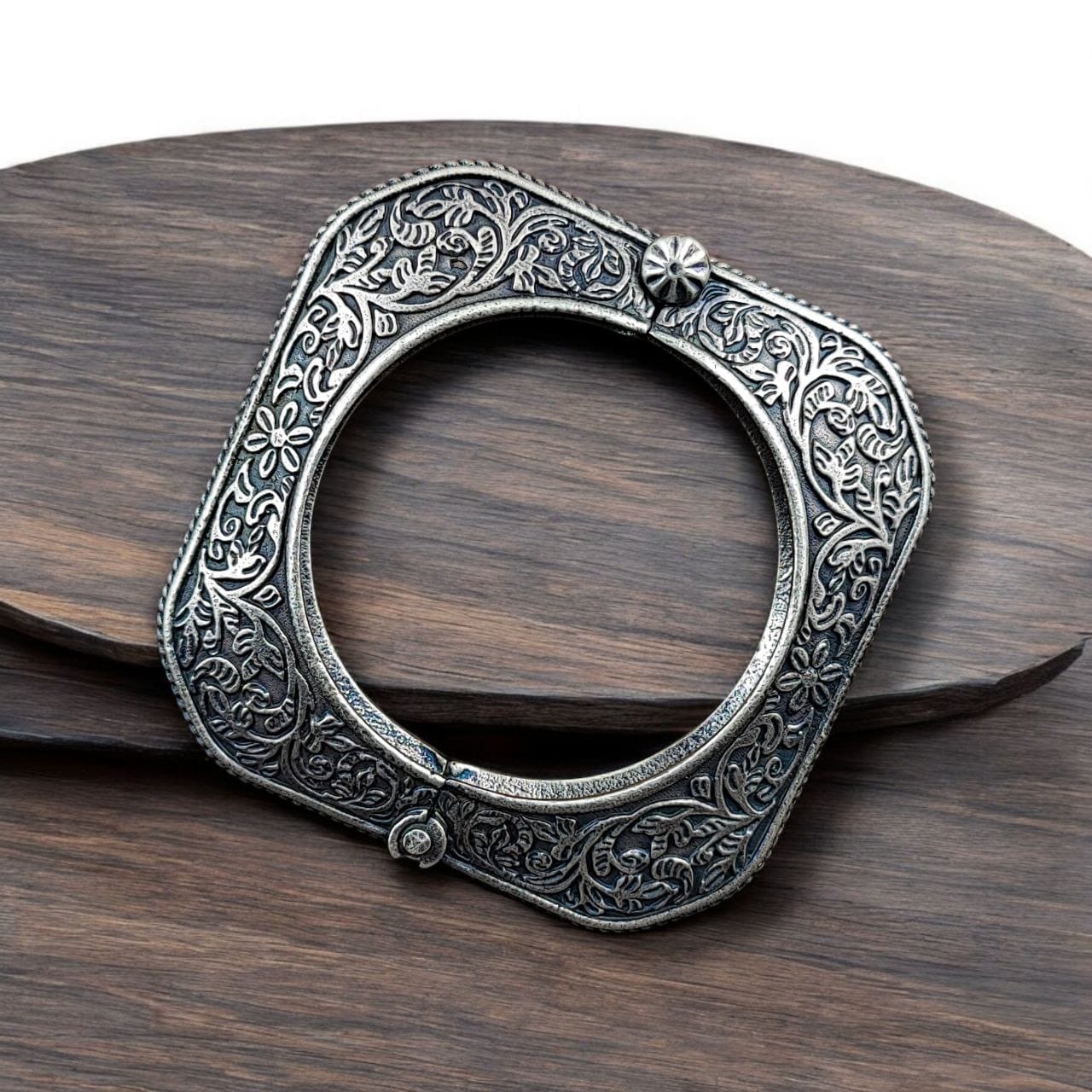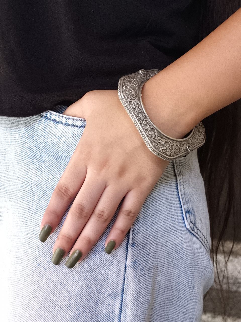 Designed with comfort in mind, this bangle features a square shape that provides a modern twist on traditional kada designs. Its openable structure ensures easy wear and removal, allowing for a comfortable fit on different wrist sizes. Whether you choose to wear it alone for a statement look or stack it with other bangles for a trendy layered style, the Ancient Look Floral Bracelet effortlessly complements your personal fashion sense.