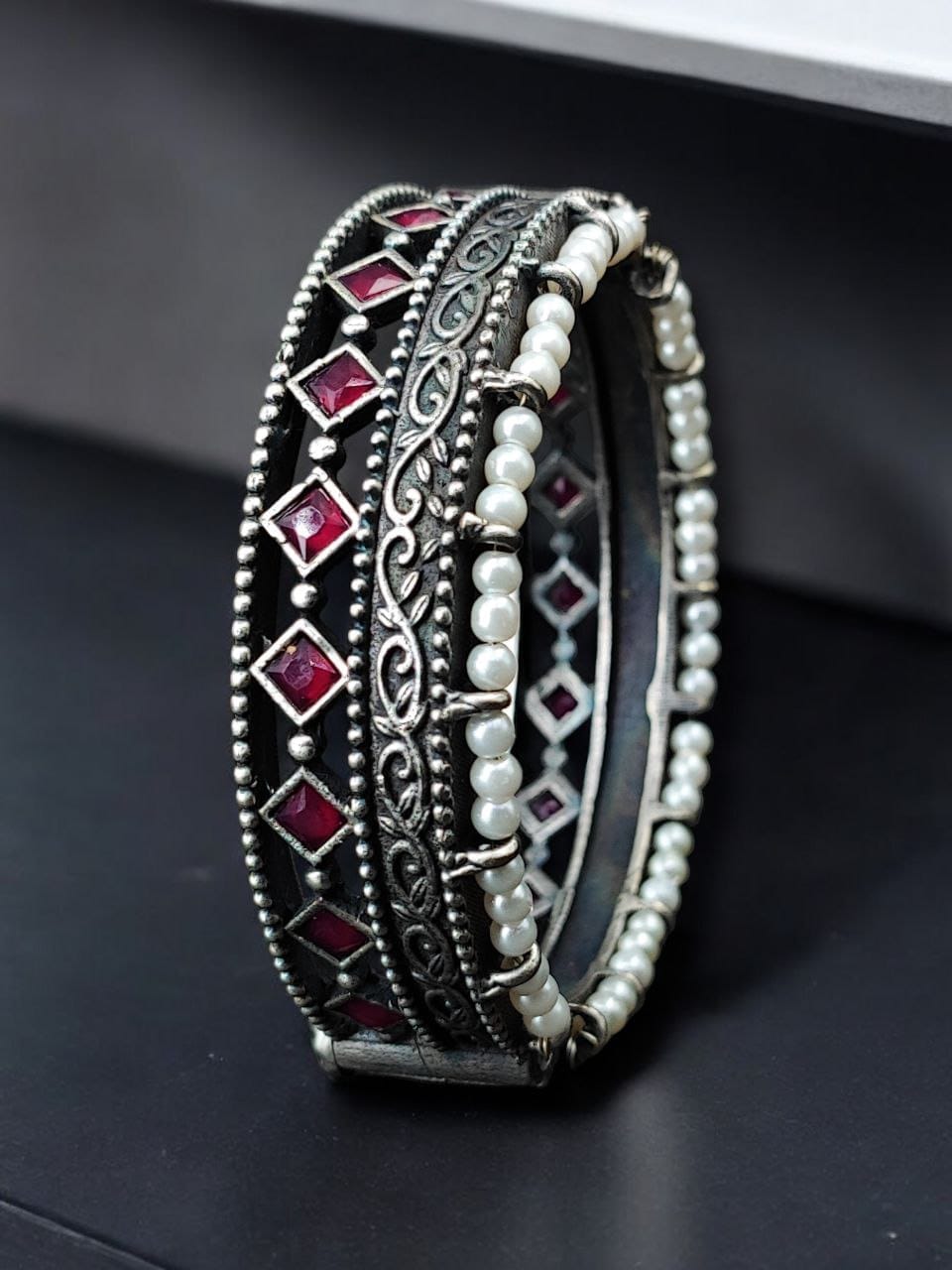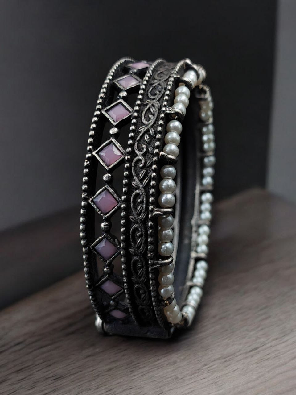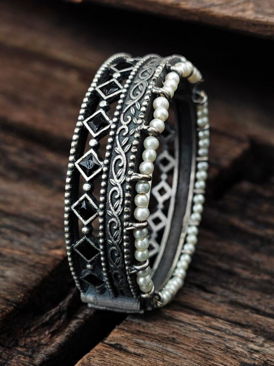 Crafted with attention to detail, the oxidized finish gives the bracelet a vintage appeal, reminiscent of traditional jewelry with a modern twist. The soft shimmer of the pearls complements the bold oxidized look, creating a beautiful contrast that draws attention to your wrist. This unique combination of oxidized silver and pearl accents makes the kada/bracelet perfect for women who appreciate luxurious yet understated jewelry. Its versatile design allows it to pair effortlessly with both traditional and contemporary outfits, making it a must-have accessory for your jewelry box.