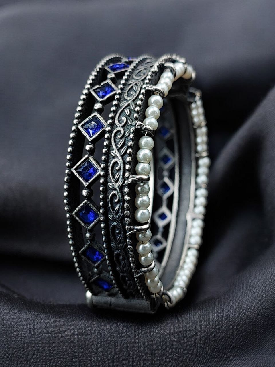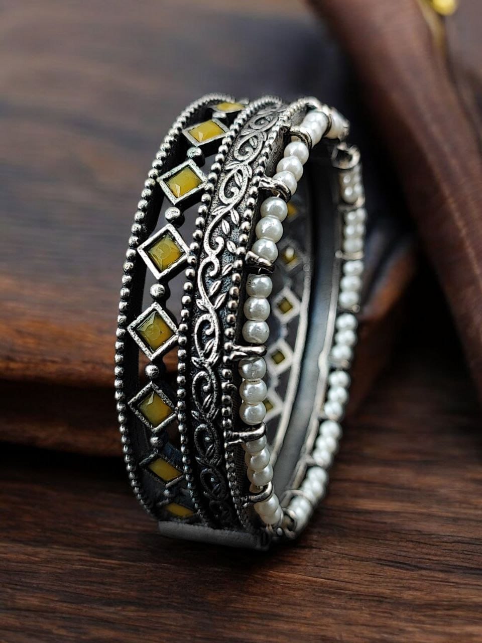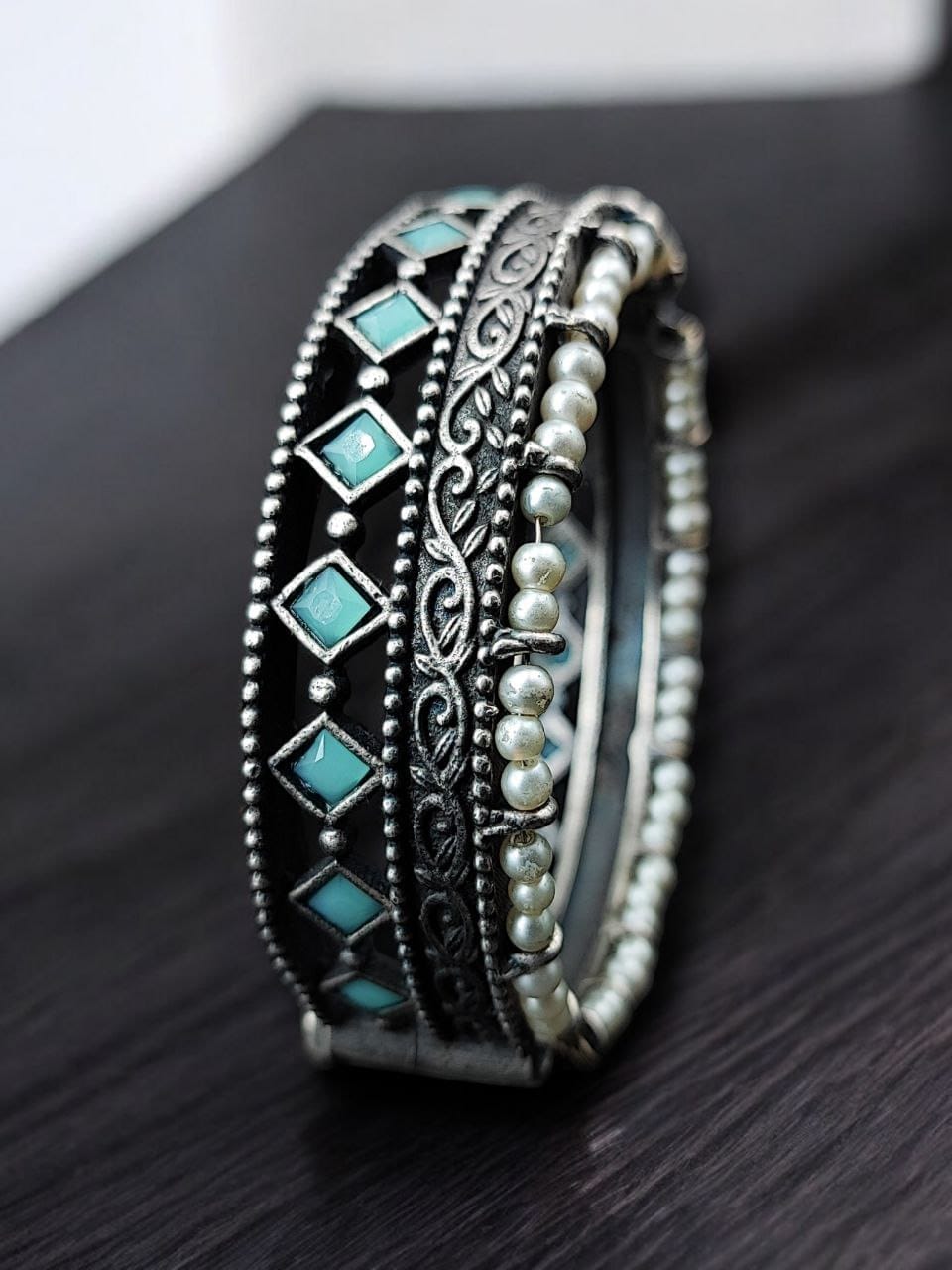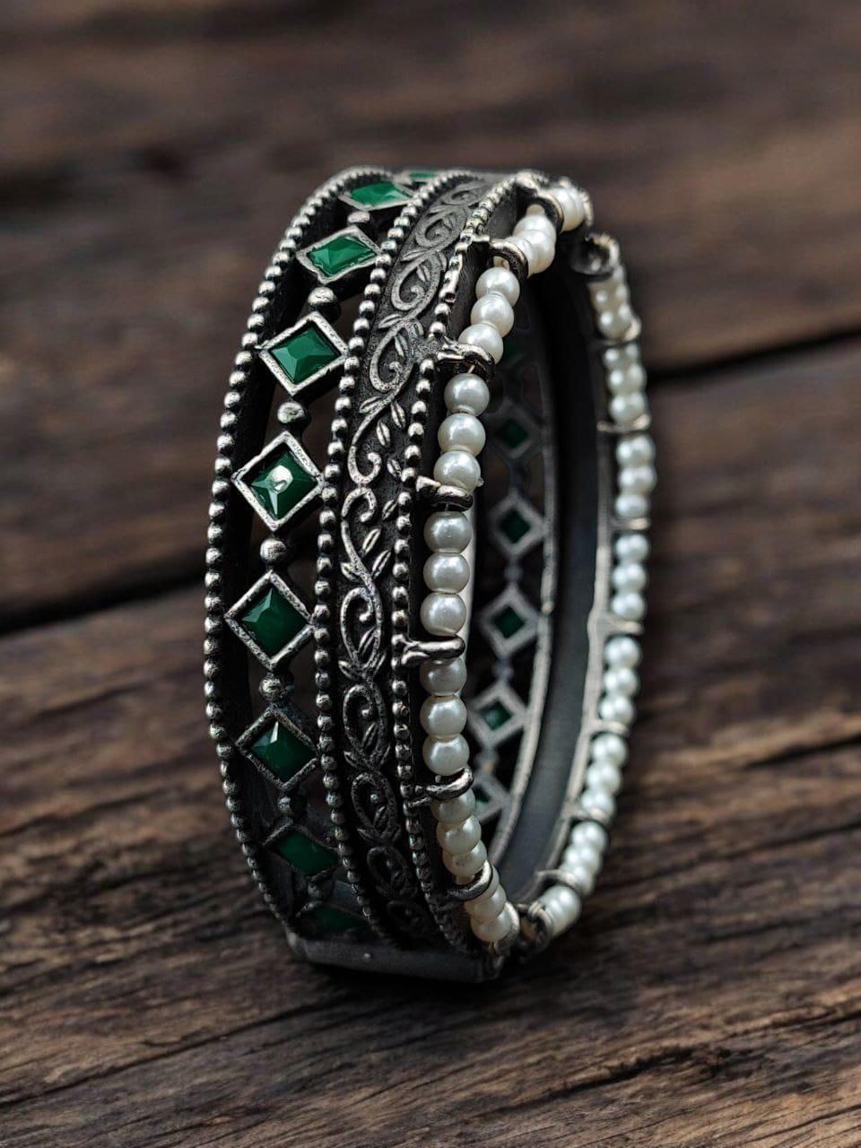 Crafted with attention to detail, the oxidized finish gives the bracelet a vintage appeal, reminiscent of traditional jewelry with a modern twist. The soft shimmer of the pearls complements the bold oxidized look, creating a beautiful contrast that draws attention to your wrist. This unique combination of oxidized silver and pearl accents makes the kada/bracelet perfect for women who appreciate luxurious yet understated jewelry. Its versatile design allows it to pair effortlessly with both traditional and contemporary outfits, making it a must-have accessory for your jewelry box.