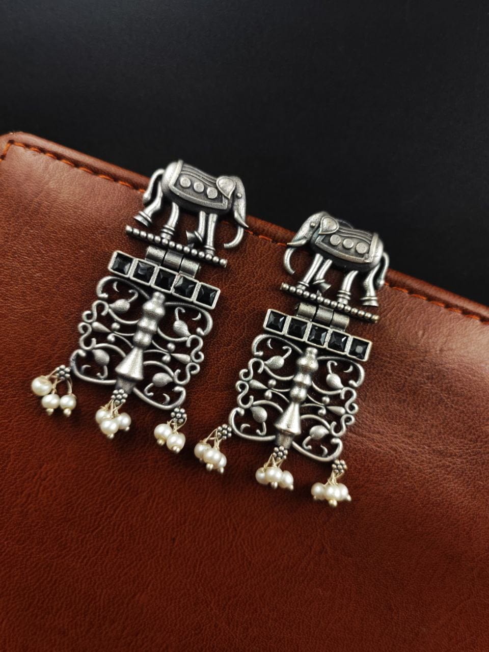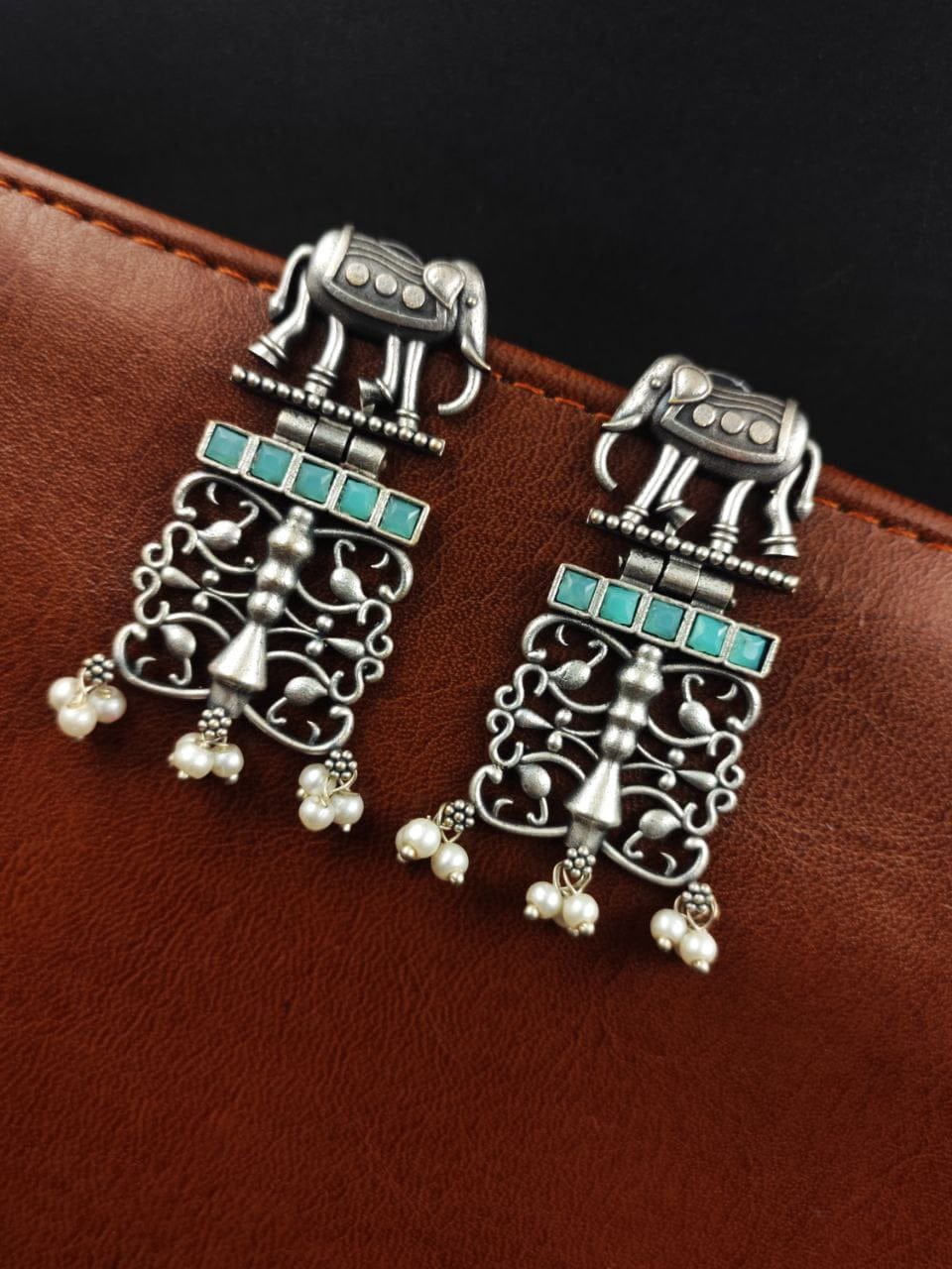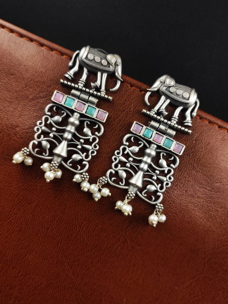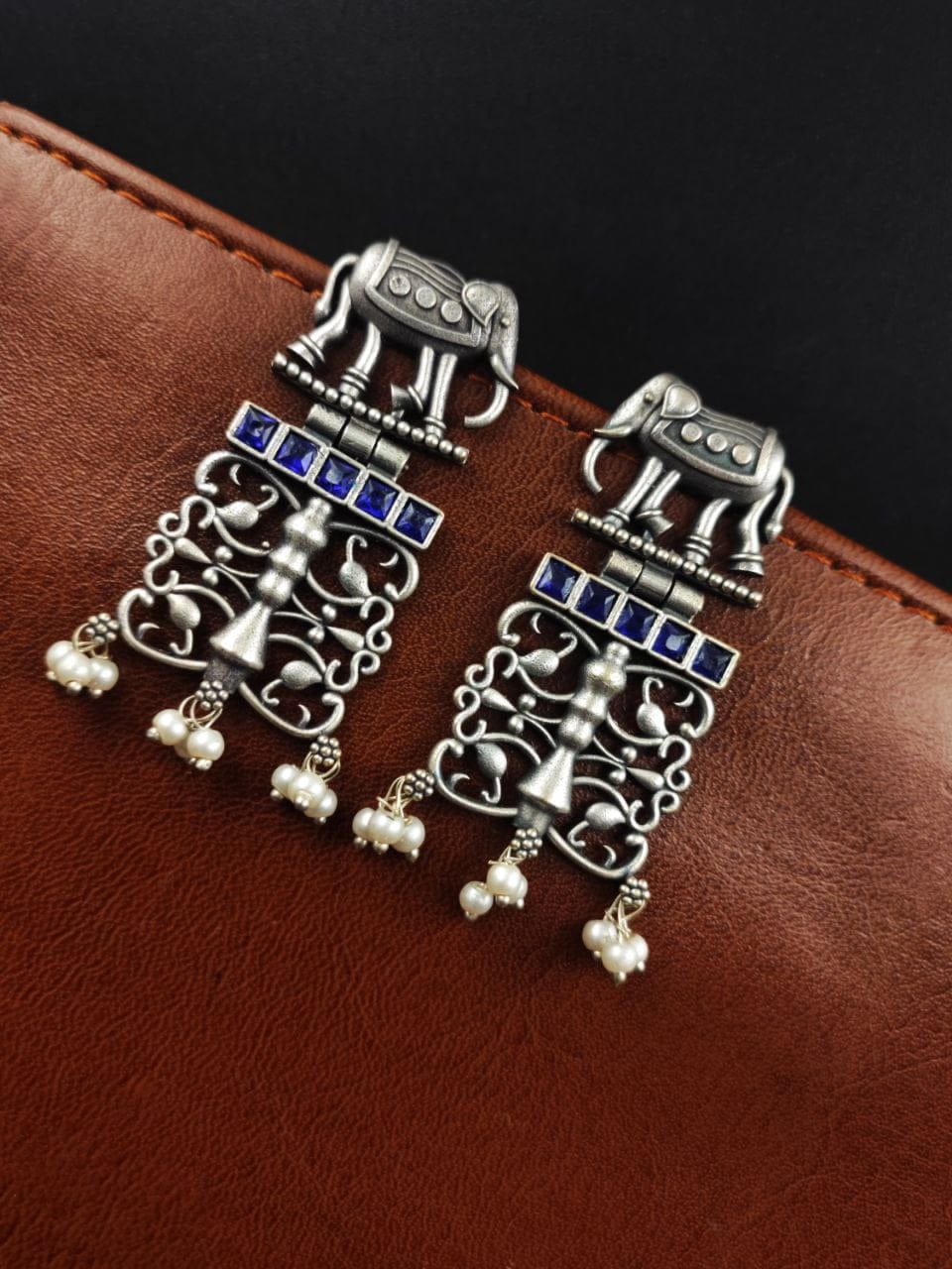 Each earring features a beautifully sculpted elephant motif, expertly crafted from high-quality antique silver. The oxidized finish adds depth and dimension to the design, enhancing its vintage appeal and giving it a distinct, rustic charm.