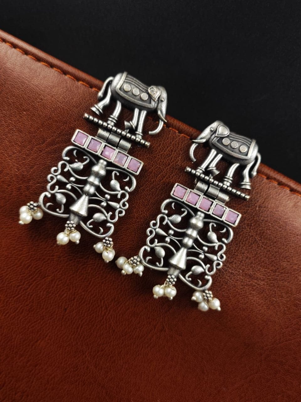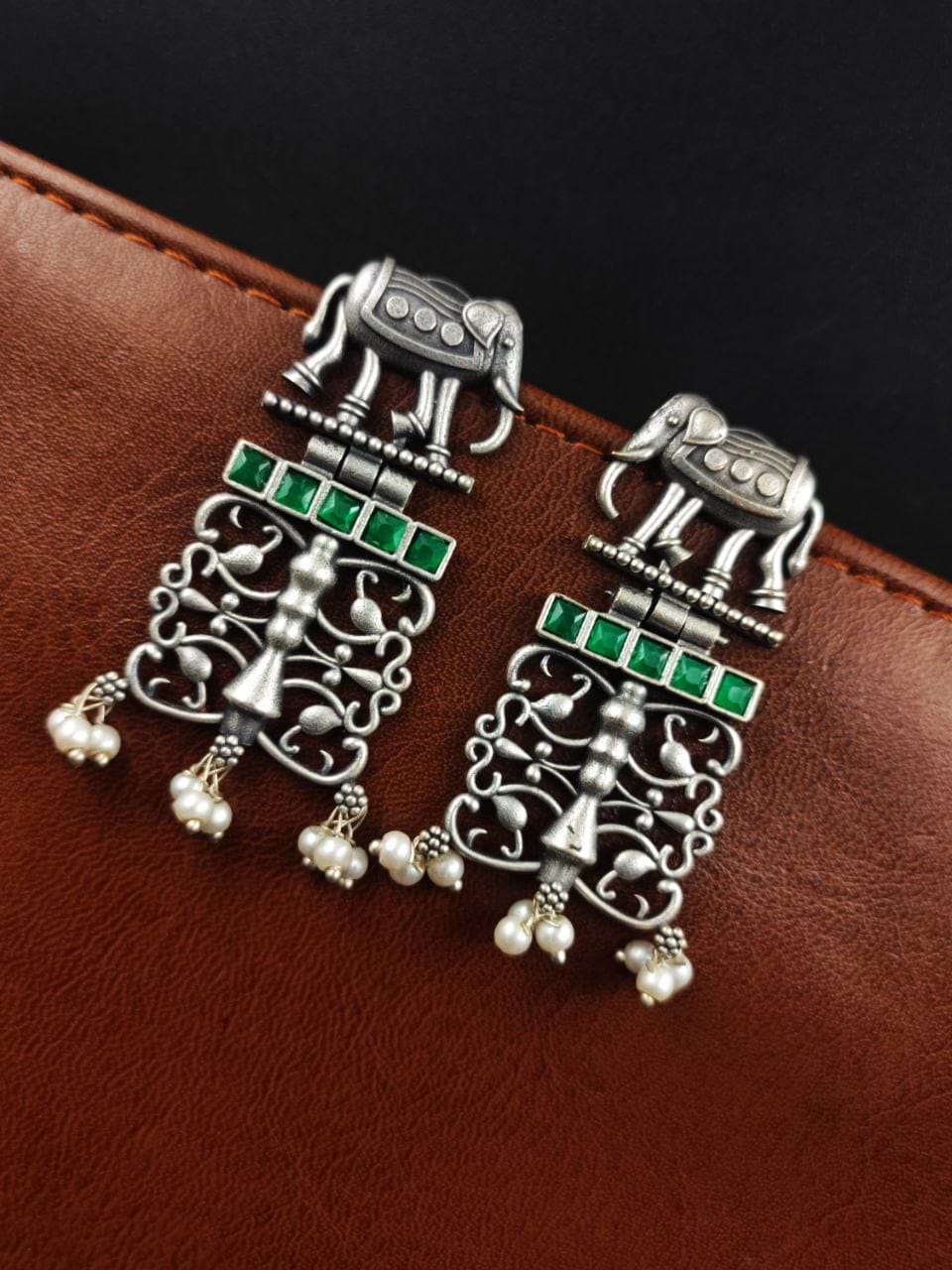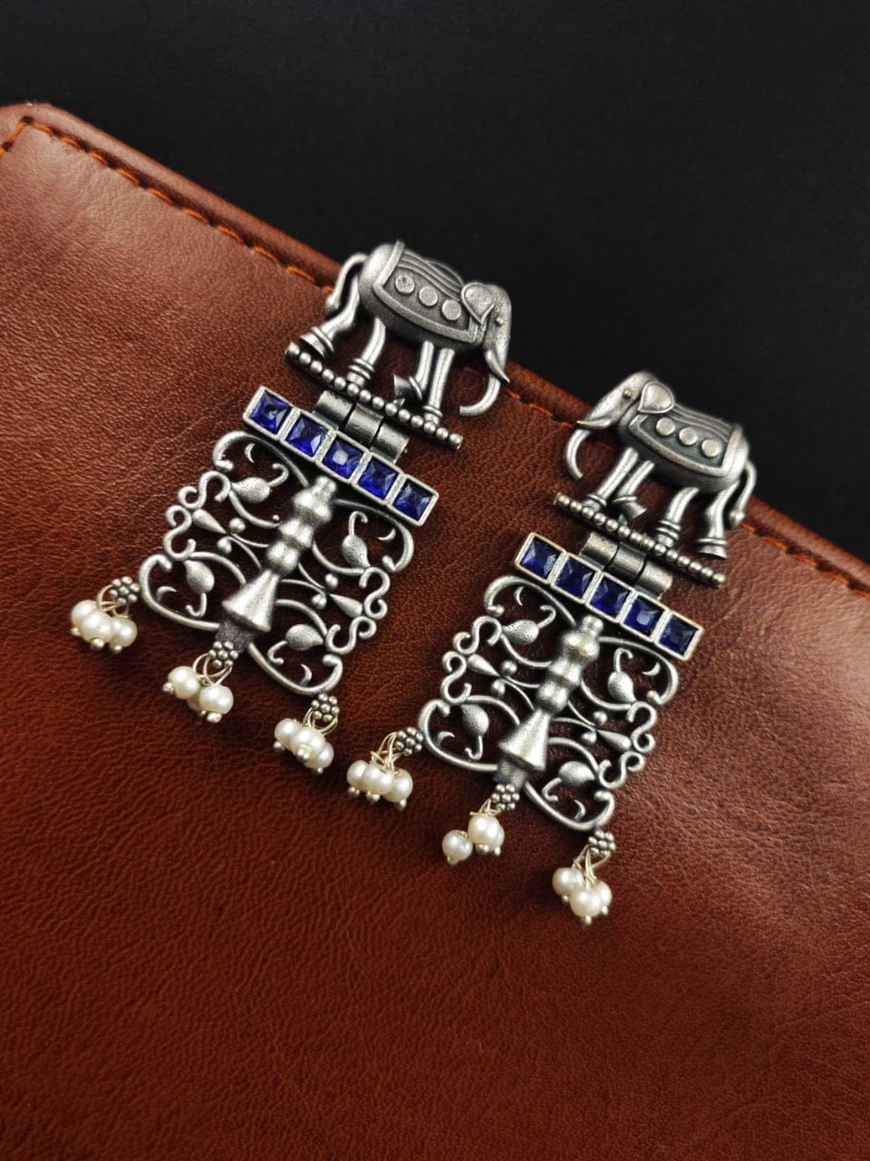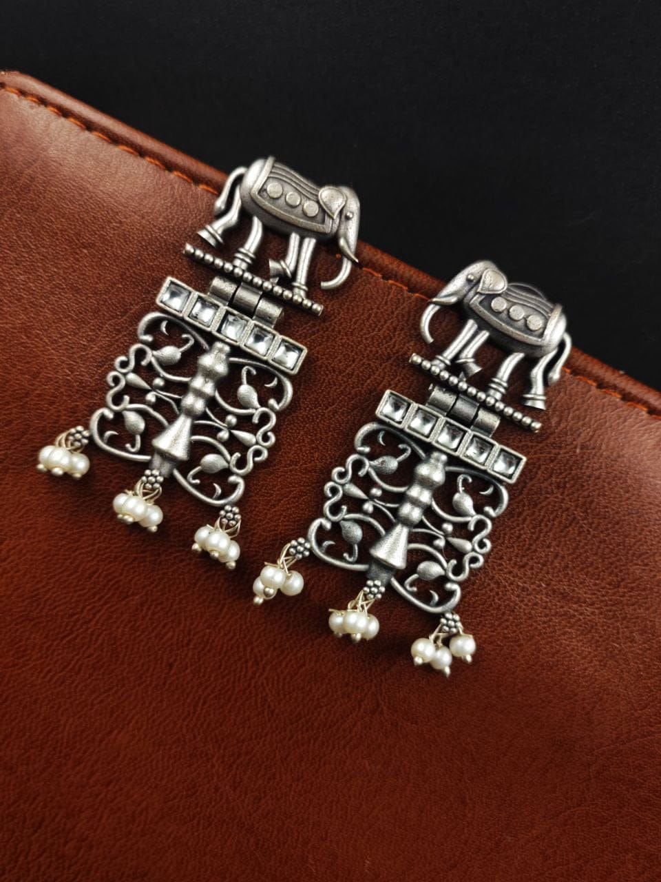 Each earring features a beautifully sculpted elephant motif, expertly crafted from high-quality antique silver. The oxidized finish adds depth and dimension to the design, enhancing its vintage appeal and giving it a distinct, rustic charm.