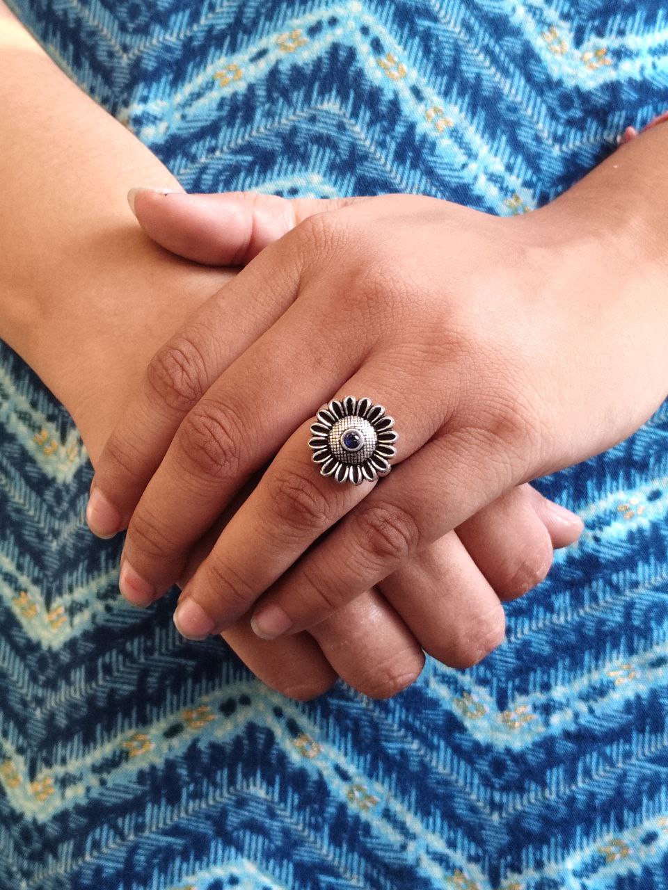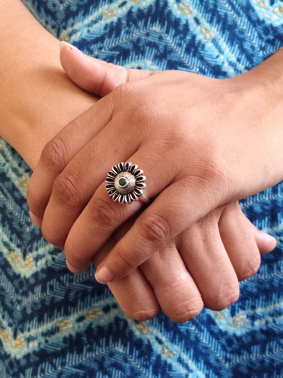 The floral design is a symbol of natural grace and femininity, while the embedded stone provides a subtle sparkle that catches the light beautifully. This unique combination of oxidized artistry and modern adaptability makes the ring an ideal choice for women who appreciate traditional jewelry with a contemporary twist.
