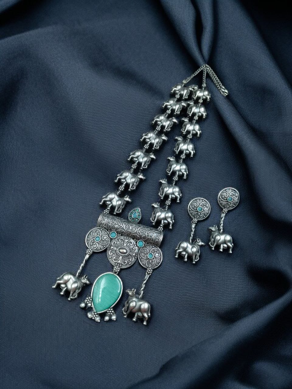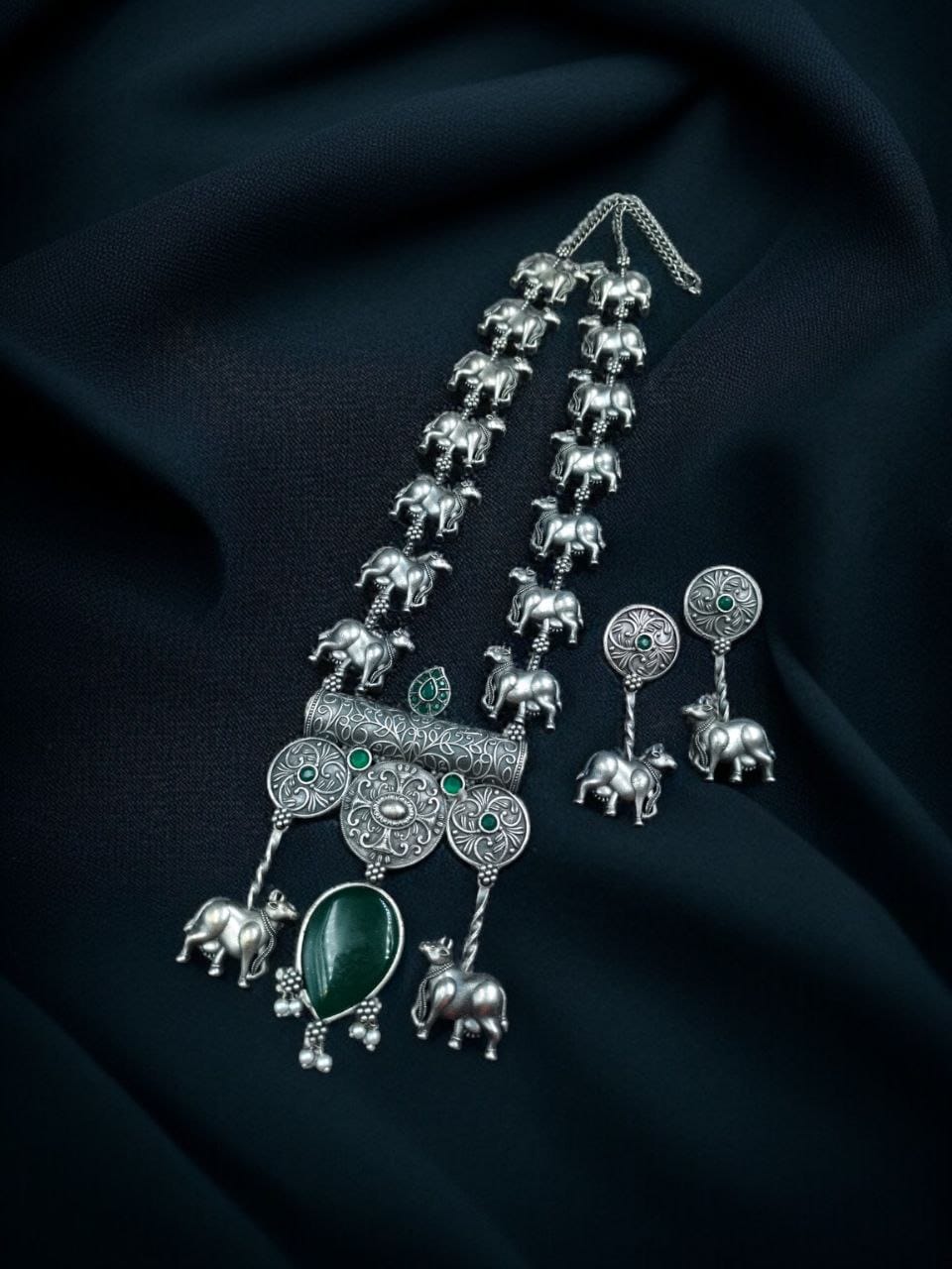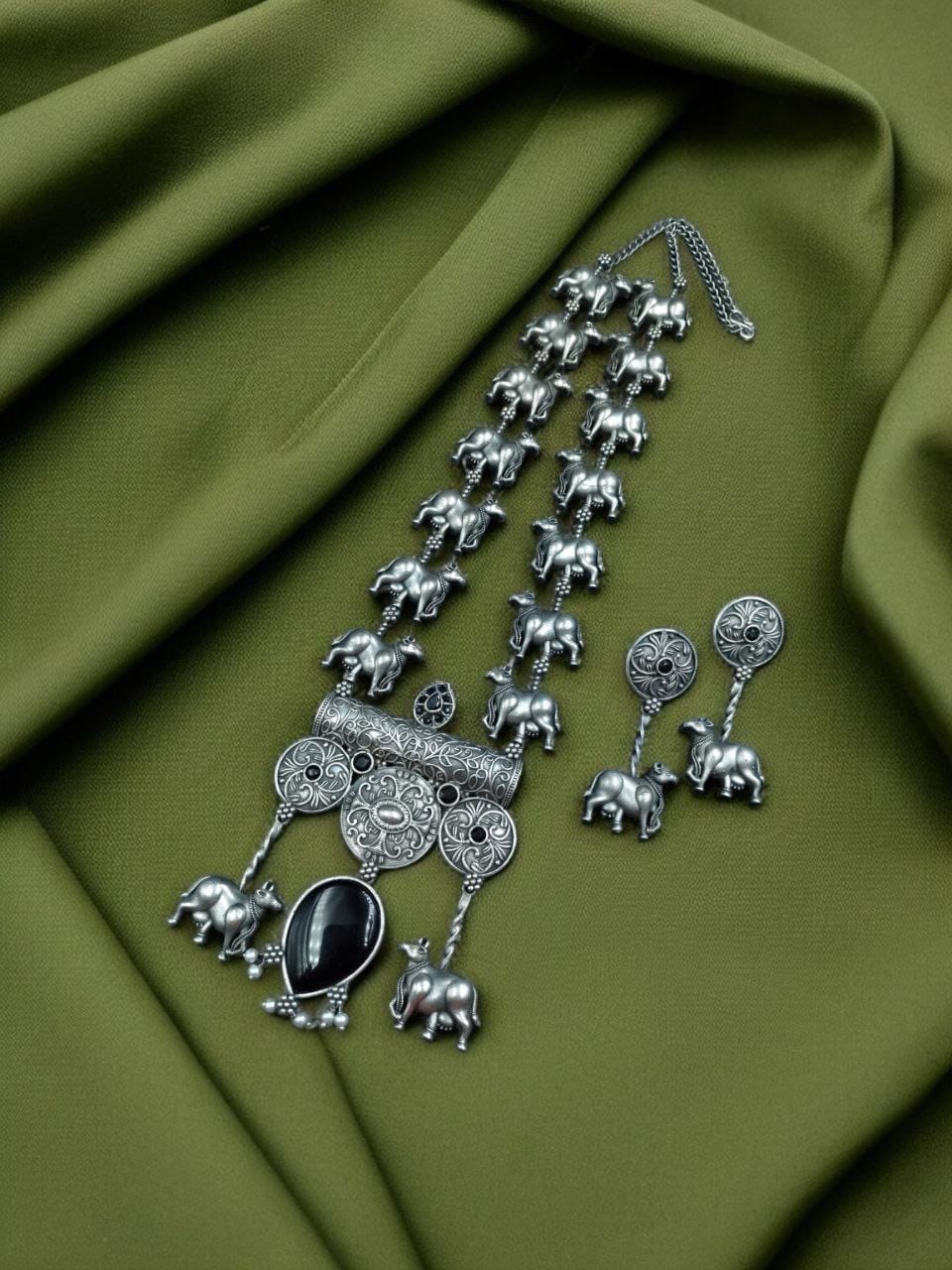 Embrace the beauty of ancient craftsmanship with the Antique-Style Oxidized Silver Nandi Necklace with Monalisa Stone, a stunning piece that blends the best of tradition and modern elegance.