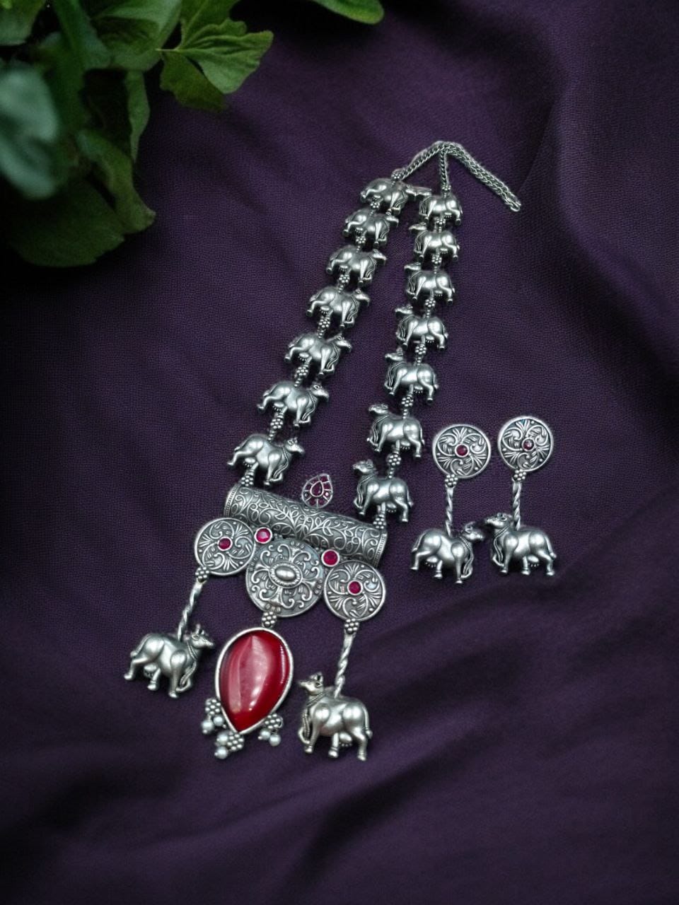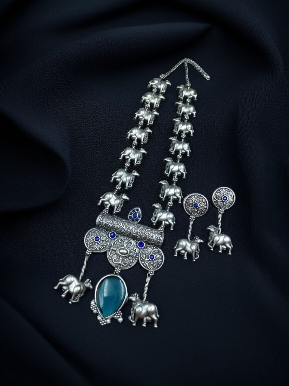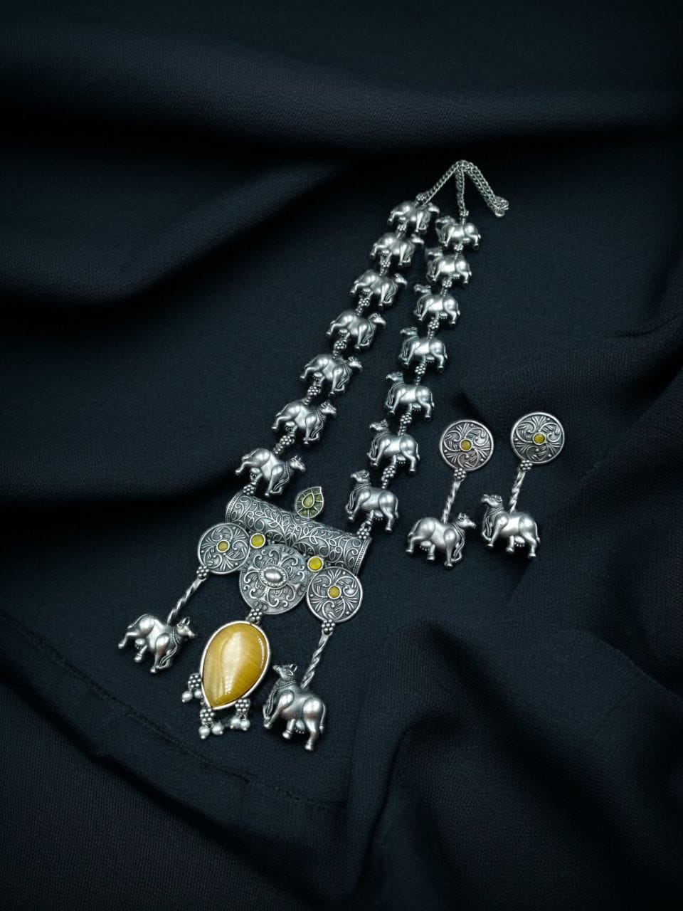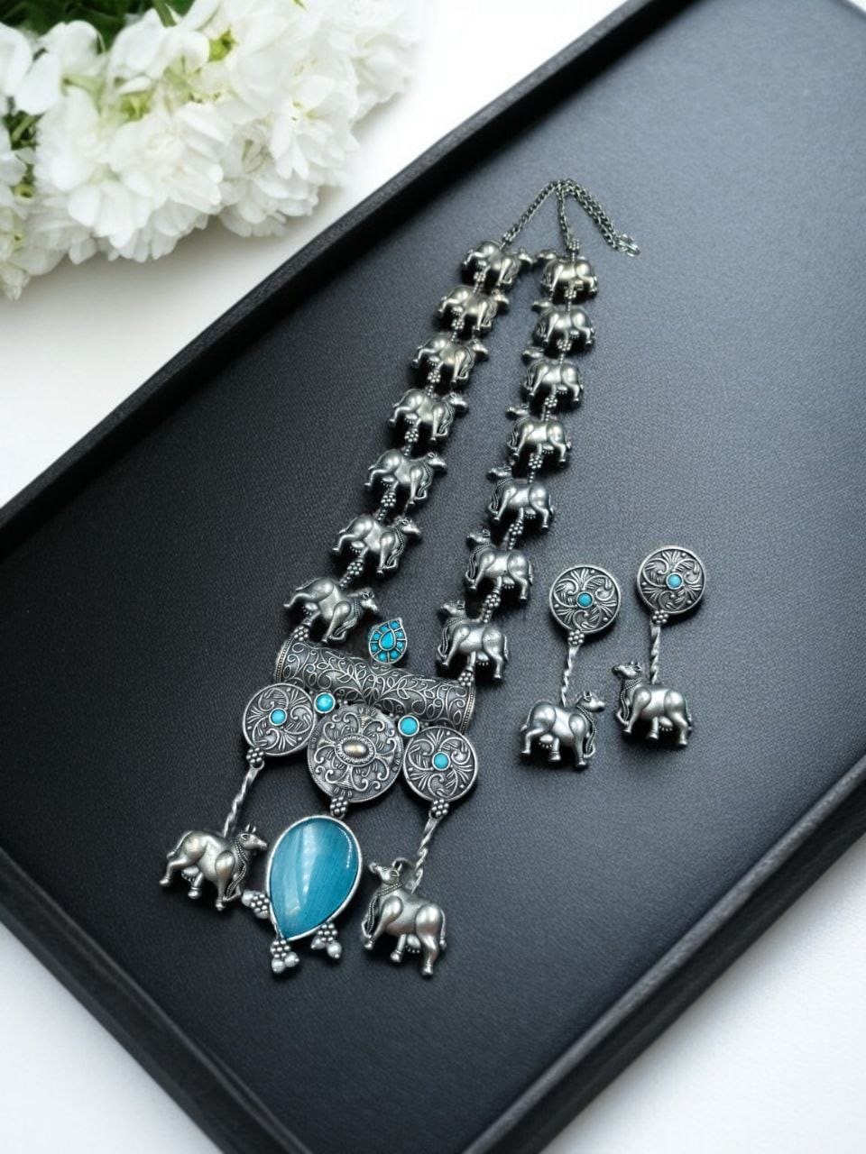 Embrace the beauty of ancient craftsmanship with the Antique-Style Oxidized Silver Nandi Necklace with Monalisa Stone, a stunning piece that blends the best of tradition and modern elegance.