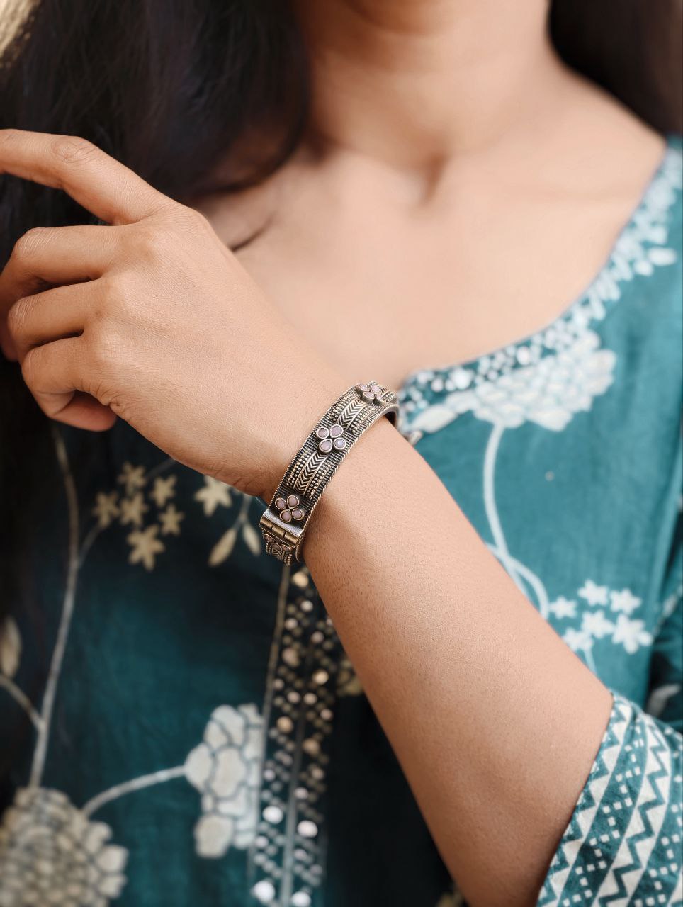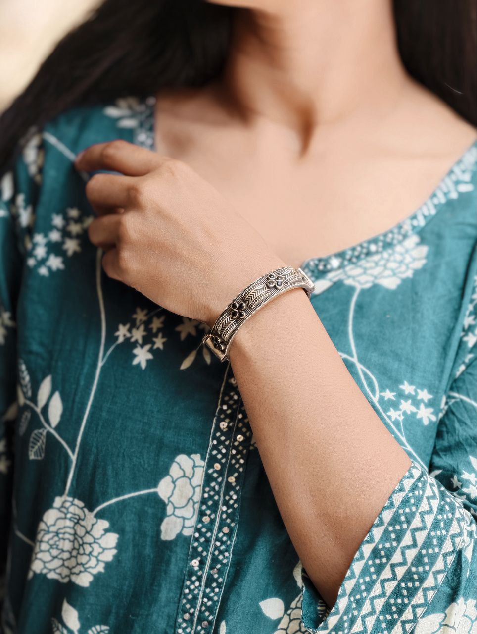This bracelet is versatile enough to pair with sarees, lehengas, salwar suits, and even Indo-western outfits. Its sophisticated silver tone adds a refined statement to your jewelry collection. The detailed carving and premium polish make it look like authentic silver jewelry, making it ideal for gifting purposes as well. If you are looking to elevate your everyday ethnic style or make a statement at special occasions, this piece is a must-have addition.