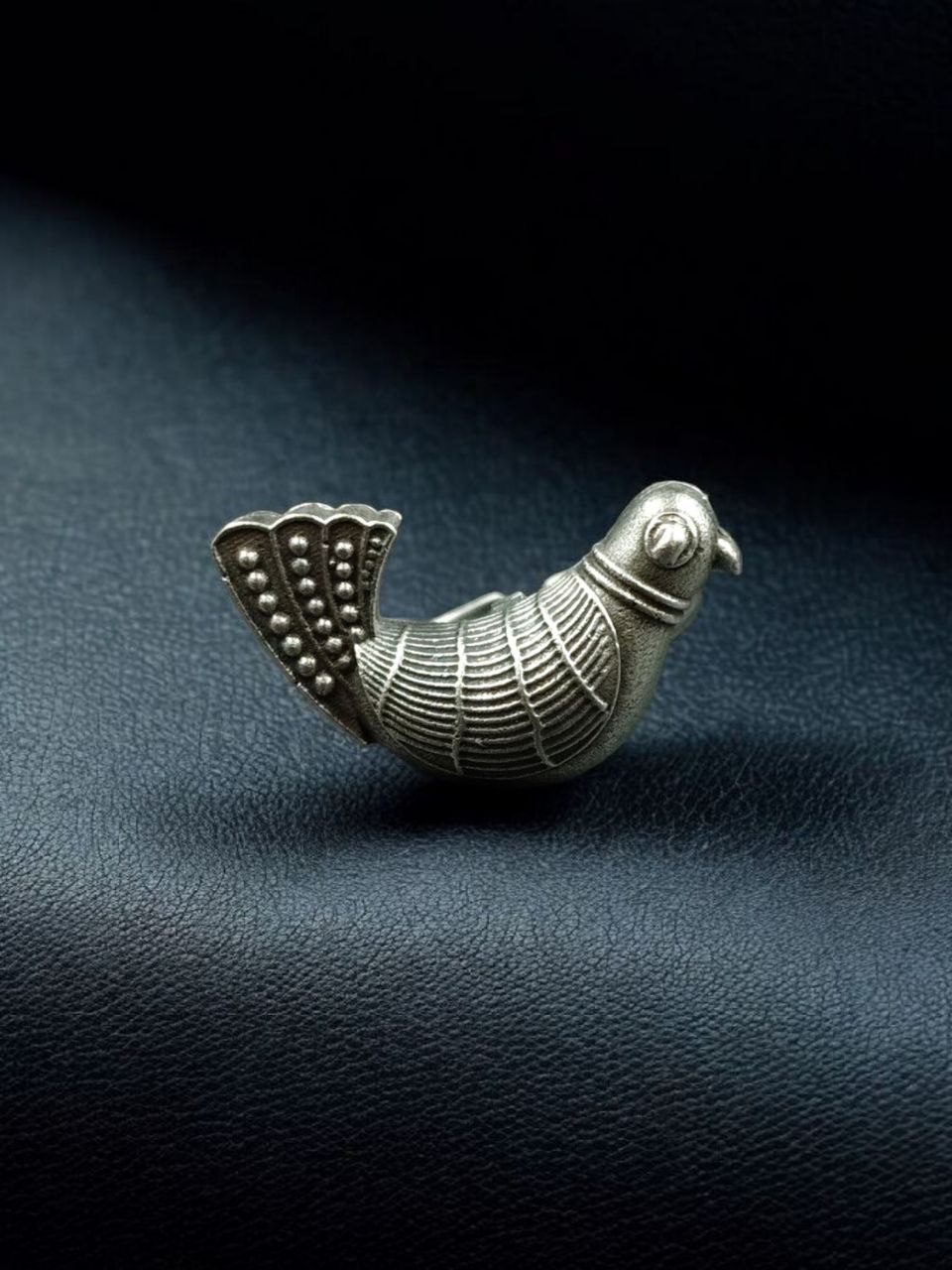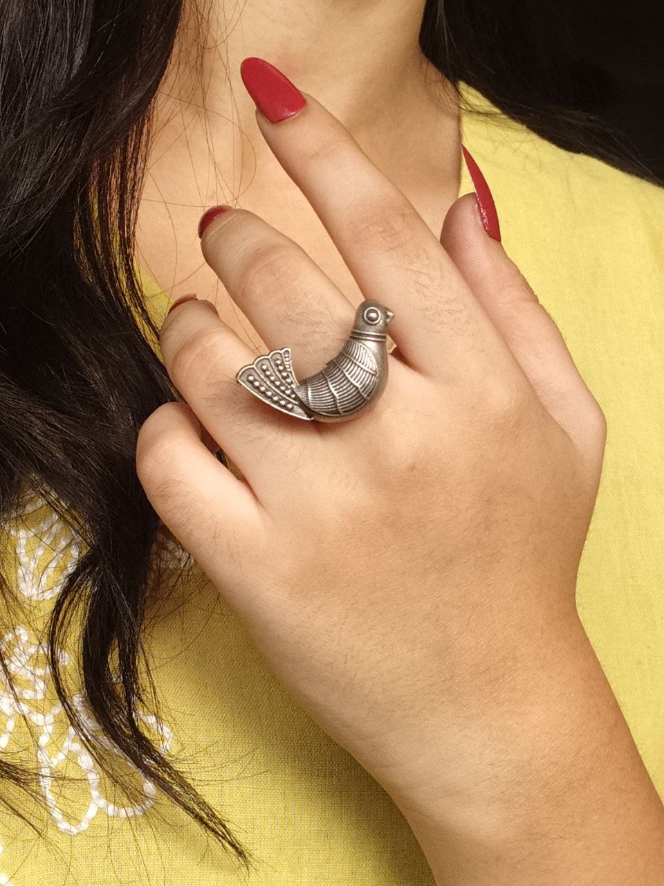 Handcrafted by skilled artisans, this ring features fine detailing that showcases the delicate wings, curves, and engravings of the bird. The oxidized silver replica polish enhances its vintage-inspired appeal, giving it a rich ethnic touch that pairs perfectly with traditional, boho, and contemporary outfits. Whether styled with kurtis, sarees, Indo-western dresses, or casual wear, this ring effortlessly elevates your entire look.
