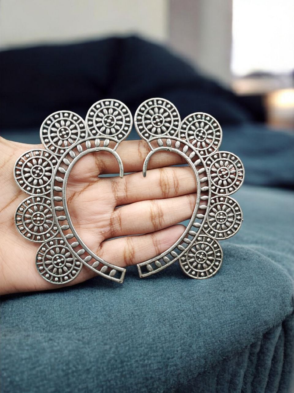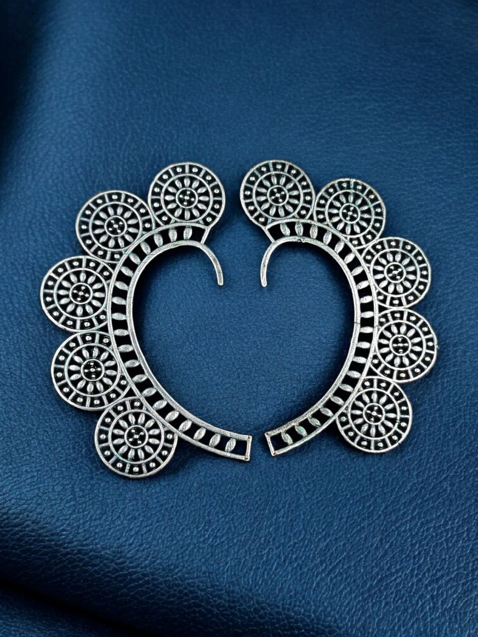 The earcuff showcases a series of beautiful circular motifs, symbolizing continuity, harmony, and timeless design. Each circle is intricately detailed, creating a visually rich pattern that stands out gracefully on the ear. The oxidized finish enhances the detailing, giving the earcuff a deep antique silver look that closely resembles traditional handcrafted silver jewelry.