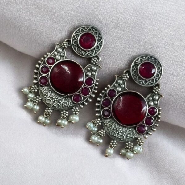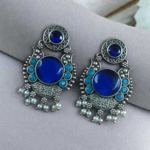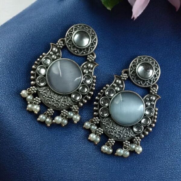 Perfect as a gift for loved ones, these Floral Art Earrings represent the charm of handcrafted jewelry. If you are someone who appreciates the blend of tradition and contemporary style, these oxidized silver-plated Floral Art Earrings? with Monalisa stone and pearl work will surely win your heart.
