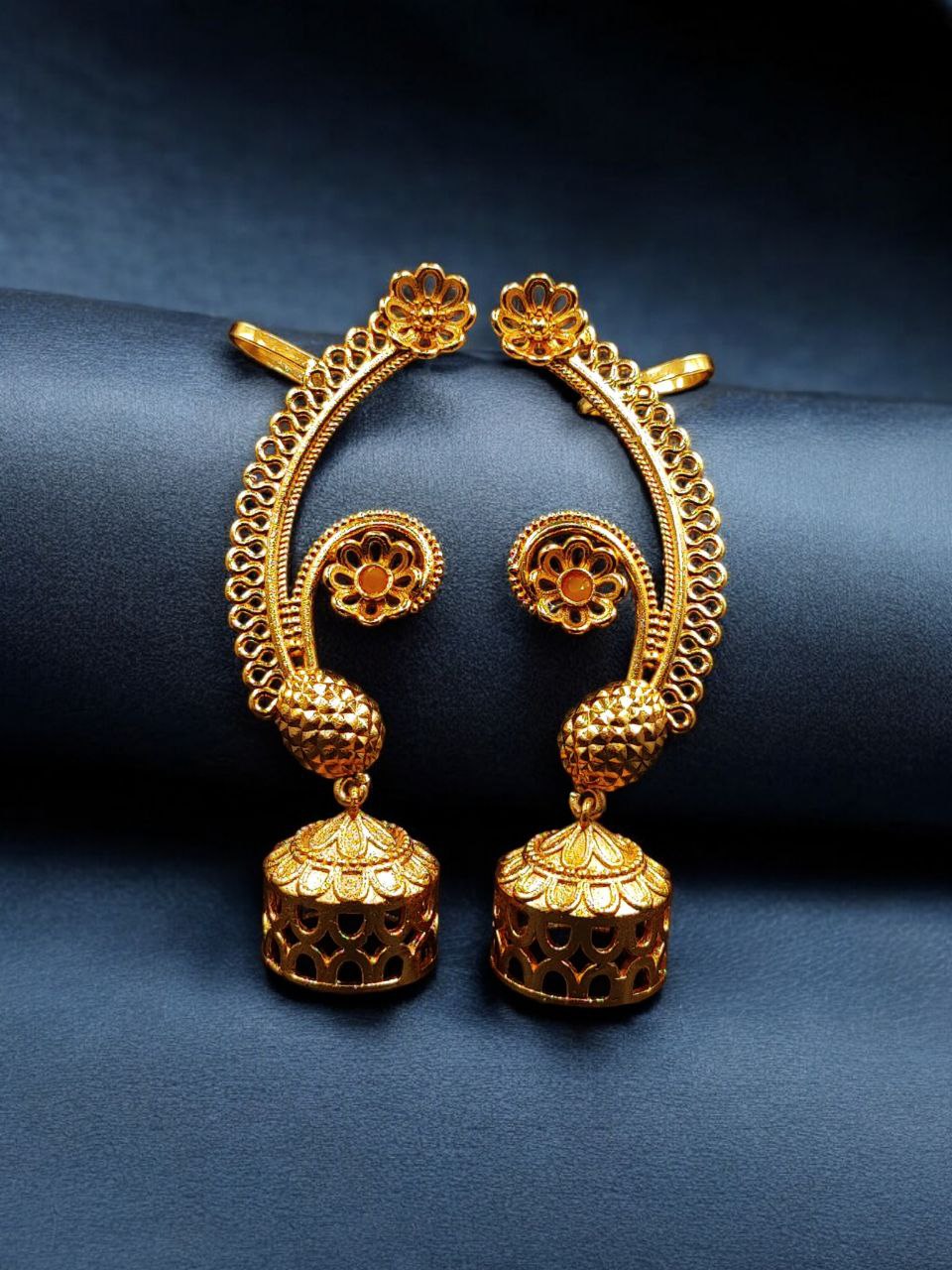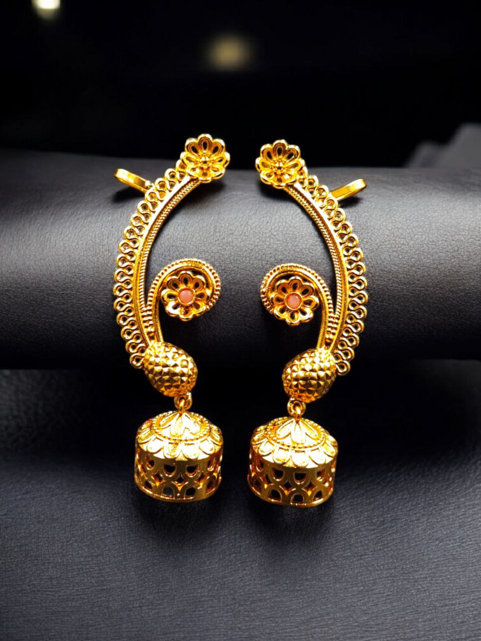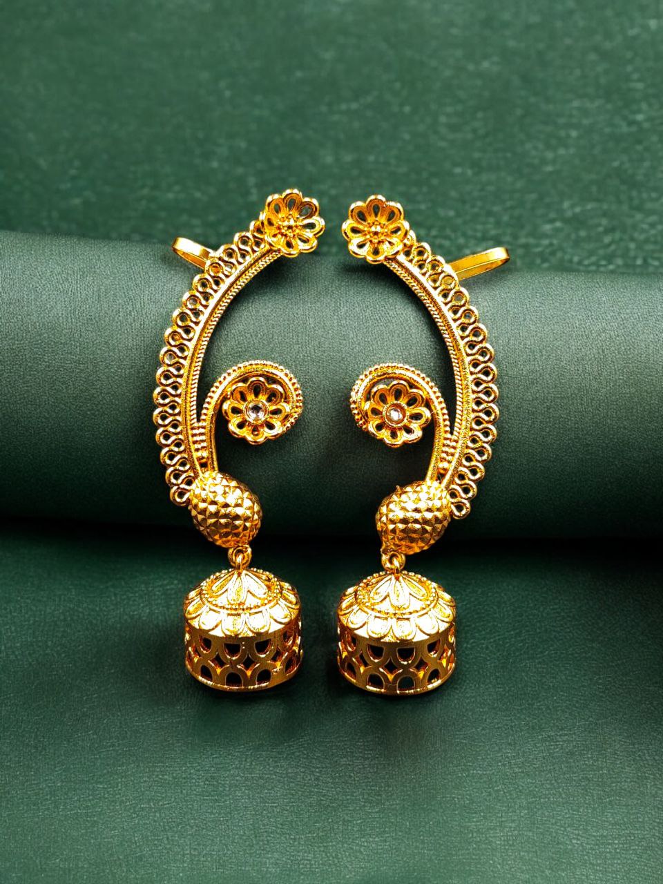 This gold plated flower design jhumka earcuff pairs beautifully with sarees, lehengas, anarkalis, suits, and Indo-western outfits. Whether worn for weddings, festivals, poojas, cultural functions, or special celebrations, it instantly enhances your look with traditional elegance and statement appeal.