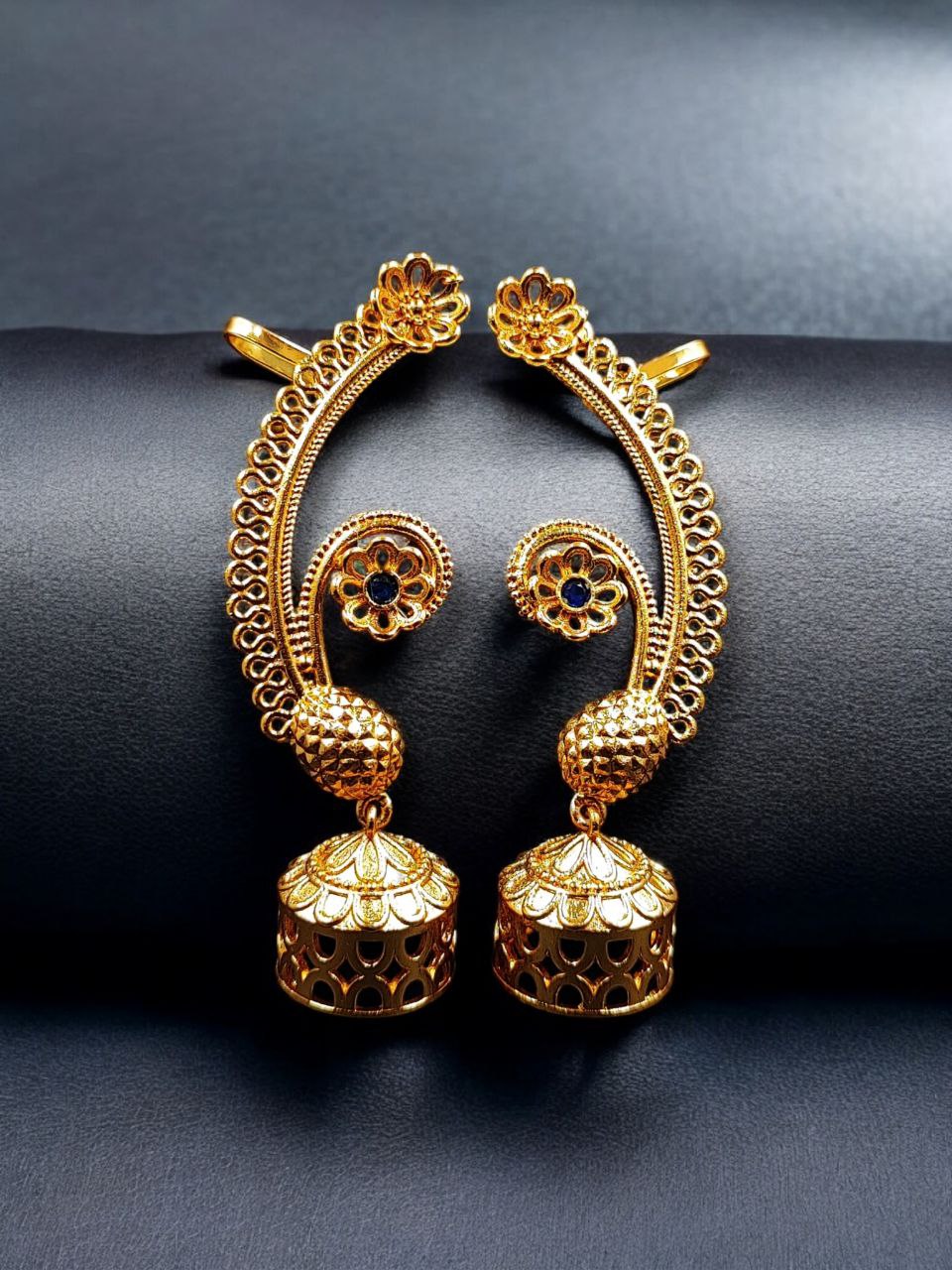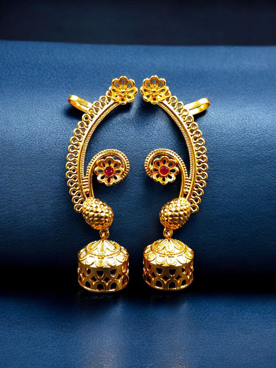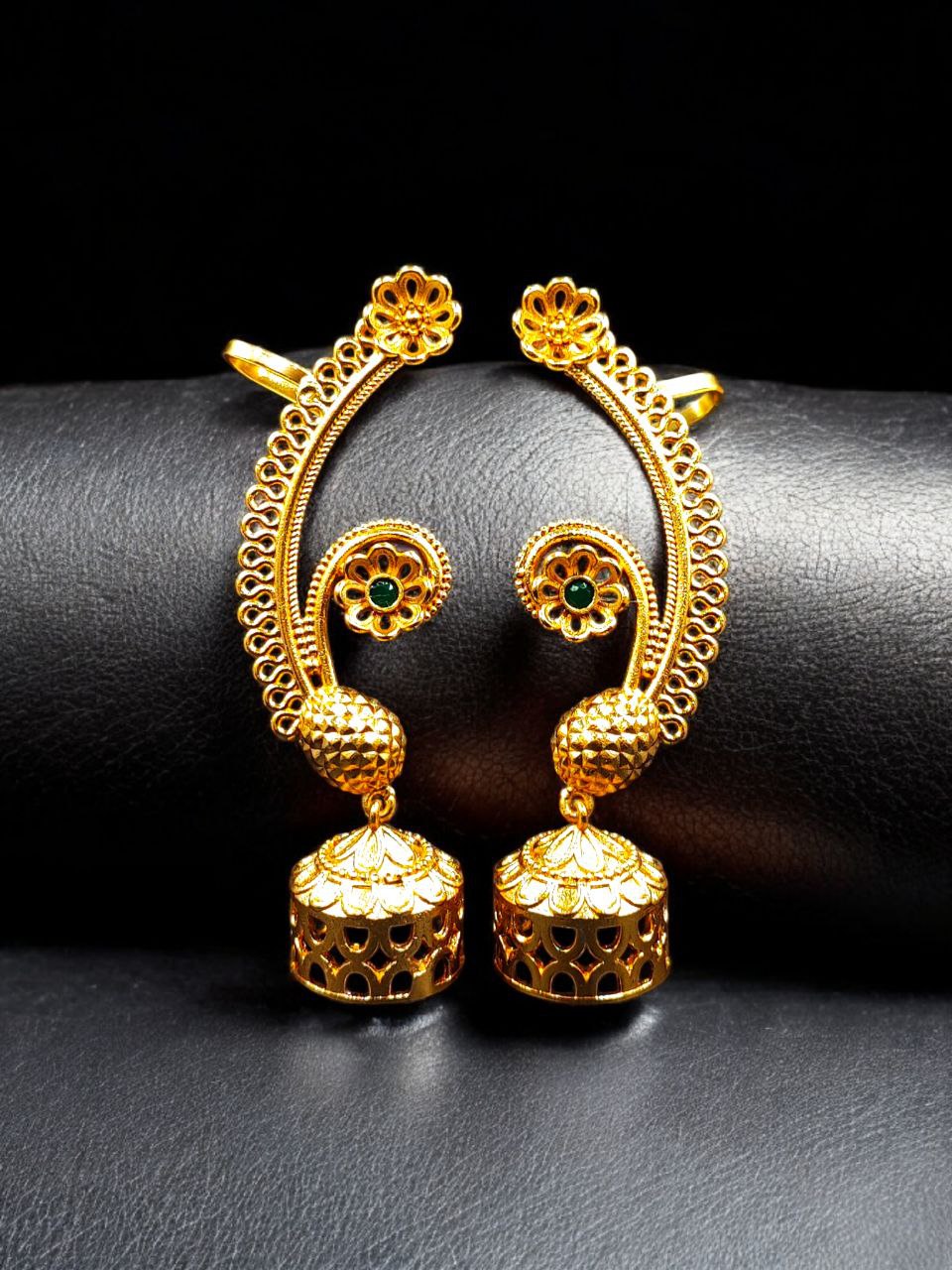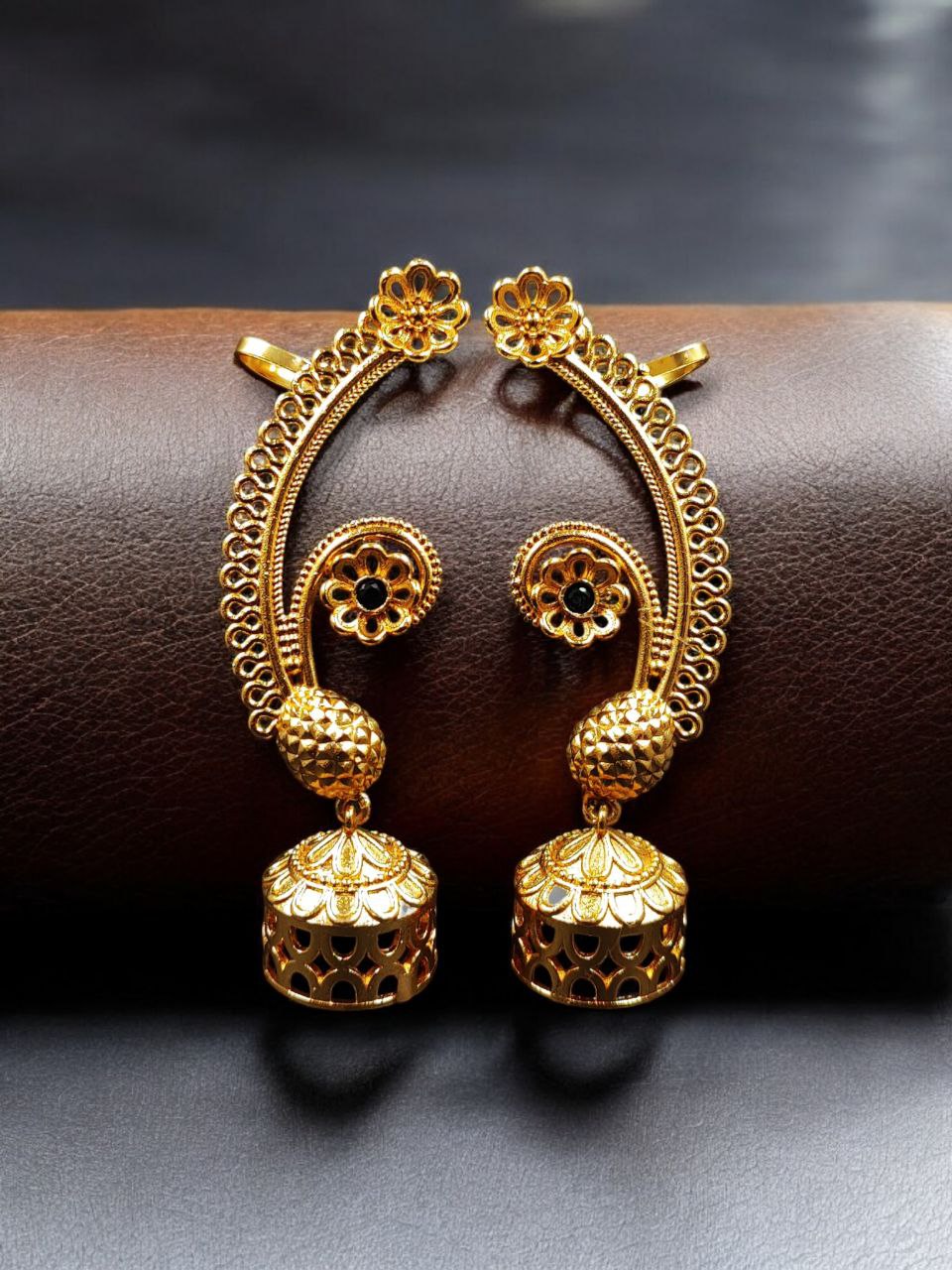This gold plated flower design jhumka earcuff pairs beautifully with sarees, lehengas, anarkalis, suits, and Indo-western outfits. Whether worn for weddings, festivals, poojas, cultural functions, or special celebrations, it instantly enhances your look with traditional elegance and statement appeal.