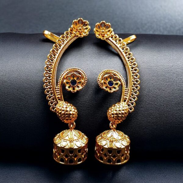 The earcuff features an intricately designed flower motif, symbolizing beauty, grace, and femininity. The floral element sits gracefully on the ear, leading into a traditional jhumka dangler that adds elegant movement and richness to the design. Carefully placed stones enhance the floral detailing, adding subtle sparkle and elevating the overall look. The rich gold plated finish gives the jewelry a luxurious appearance that closely resembles real gold.