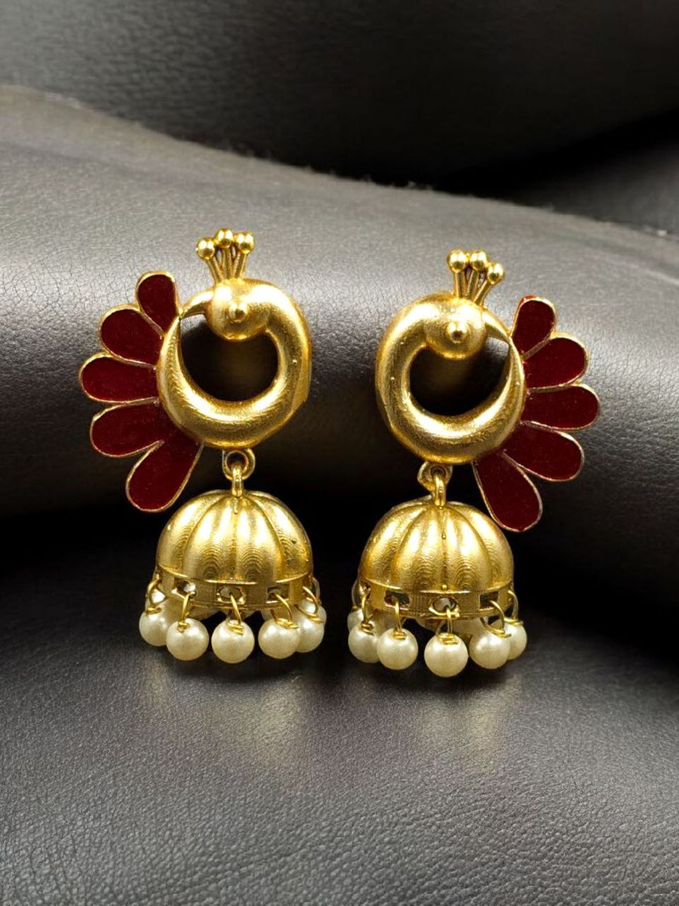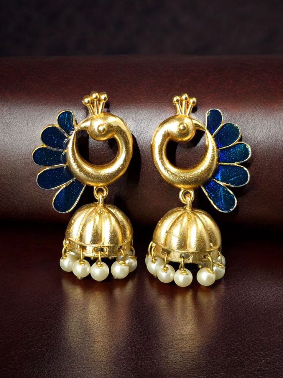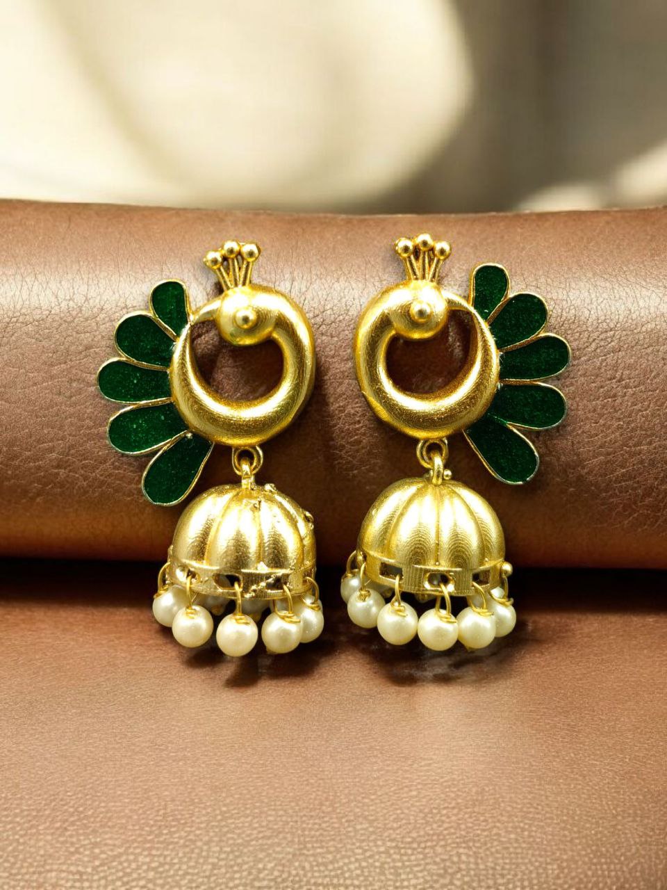 Below the peacock motif hangs a beautifully shaped jhumki, adorned with tiny pearls that add graceful movement and soft shimmer to every step you take. The pearls give the earrings an elegant finish and complement the golden hue beautifully, enhancing the ethnic charm of the entire design.