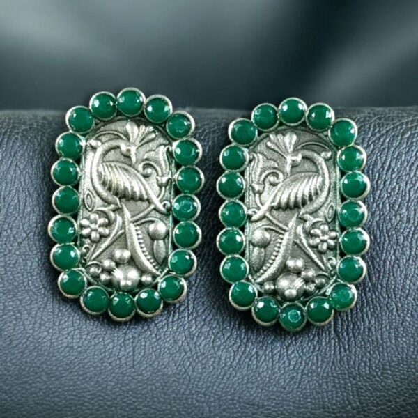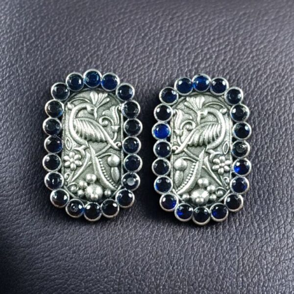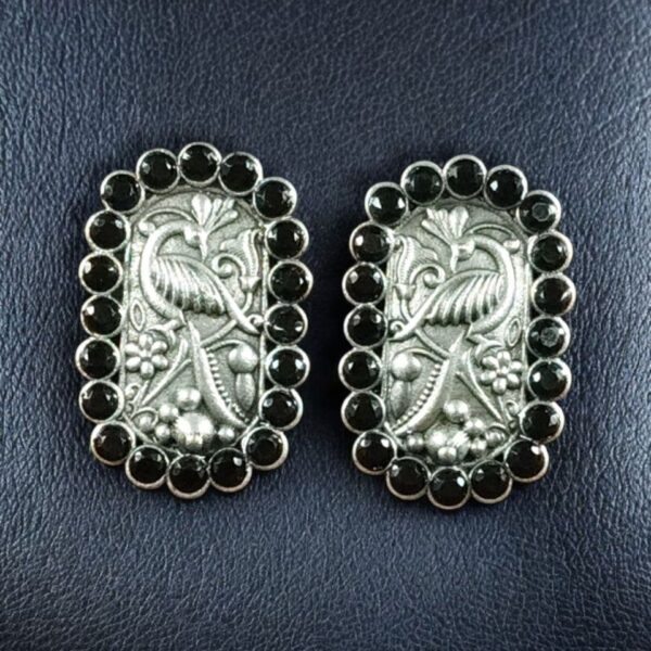 Embrace timeless beauty and cultural elegance with these Beautiful Oxidized Peacock Stud Earrings, meticulously crafted to reflect India?s rich jewelry heritage. Designed in an intricate peacock and floral art pattern, these Peacock Stud Earrings are a perfect combination of tradition, artistry, and everyday sophistication. The detailed oxidized finish, paired with a touch of silver plating and delicate stone embellishments, makes these Peacock Stud Earrings a must-have for women who adore ethnic-inspired jewelry with a modern twist.