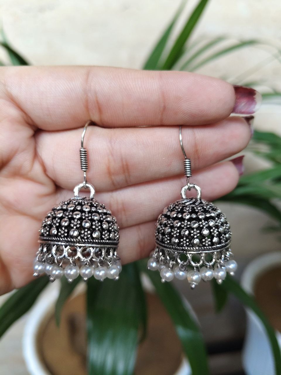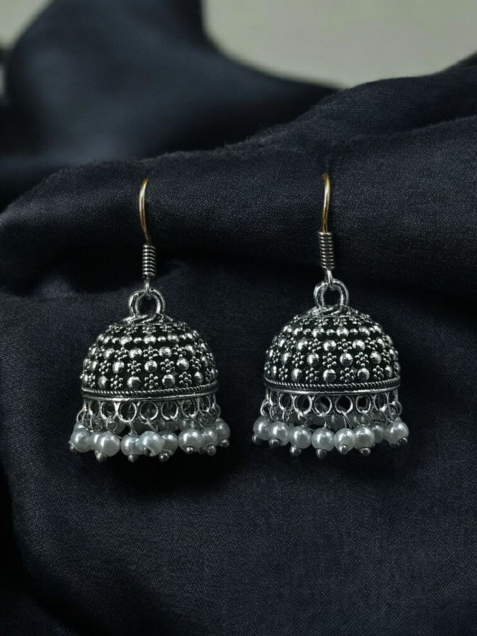 The highlight of these earrings is the delicate pearl work, which adds a touch of sophistication and enhances the traditional appeal. Pearls symbolize grace and purity, making these jhumkis perfect for special occasions, festive events, or even as a stylish daily wear option. Whether you are dressing up for a wedding function, a family gathering, or simply want to enhance your everyday outfits, these earrings bring effortless charm.