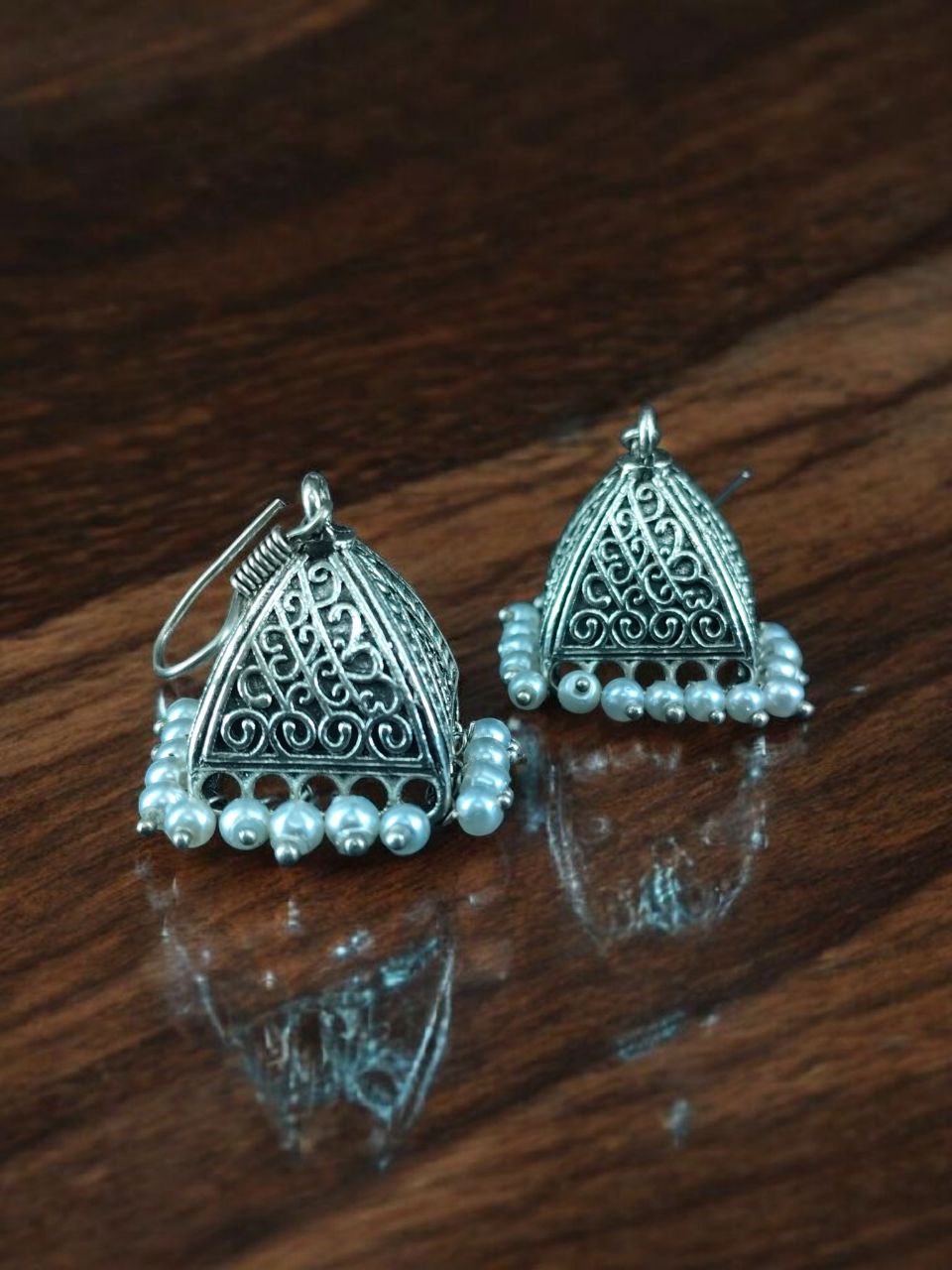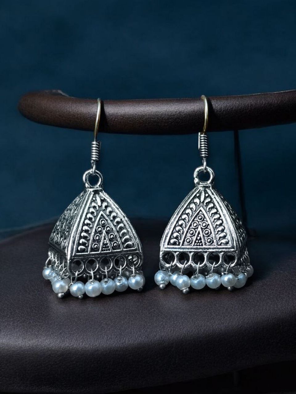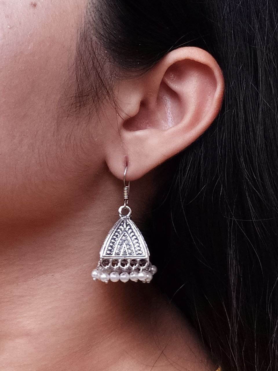 Bring home these German Silver Oxidized Pyramid Earrings with Pearl Work, and let your jewelry speak for your personality ? bold, elegant, and unique.