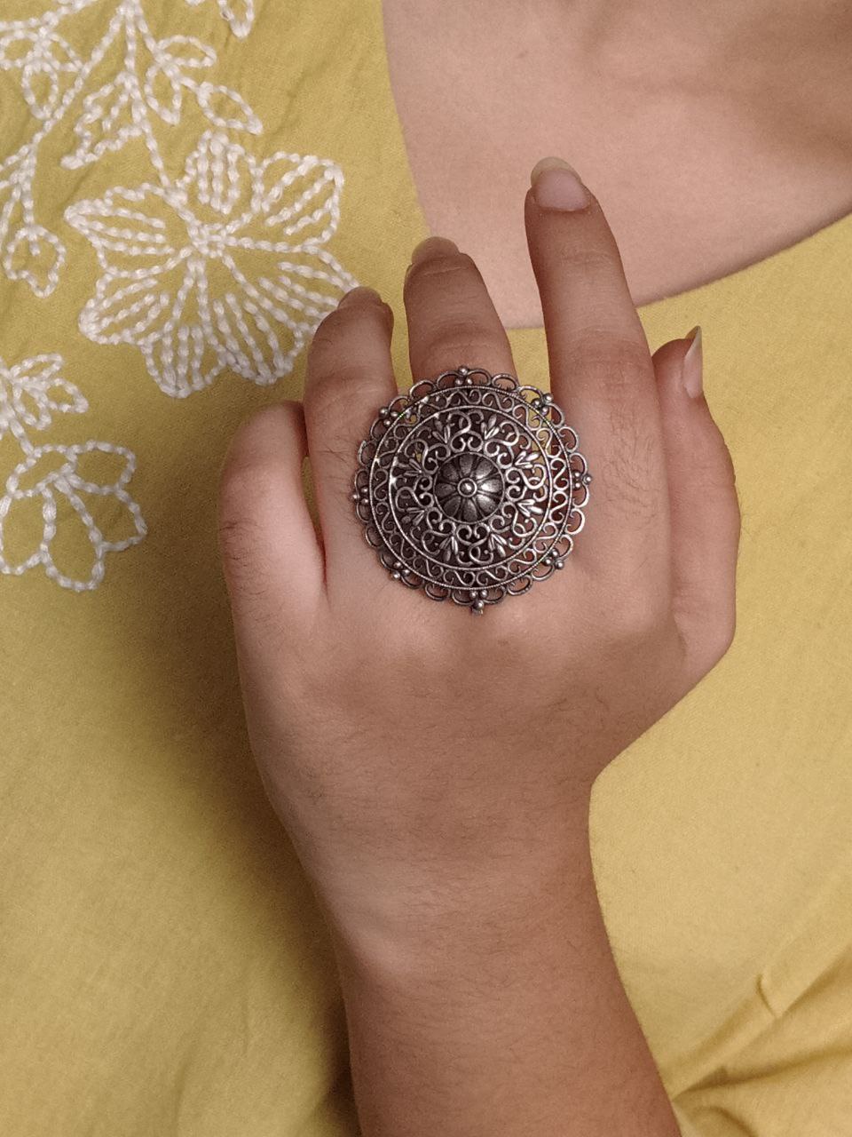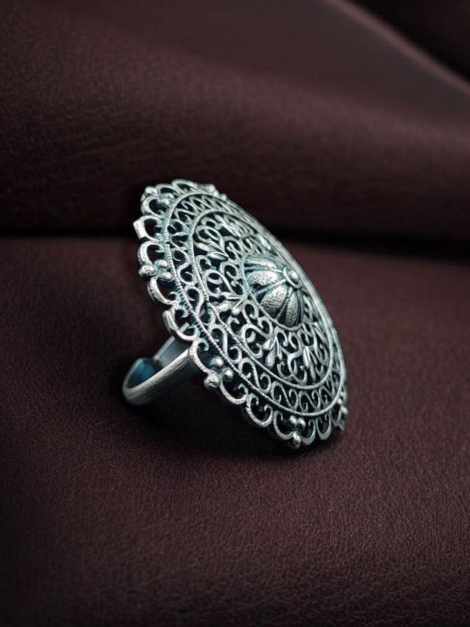 Crafted with premium silver replica plating, the ring features a stunning oxidized finish that enhances its vintage appeal. The delicate floral art design adds a soft feminine touch, beautifully representing natural beauty and grace. Intricately carved petals and fine detailing reflect expert craftsmanship, offering a refined look that suits all ages and personal styles.