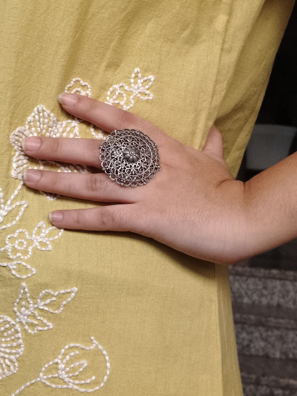 What sets this Floral Art Oxidized Ring apart is its timeless versatility. It is simple enough for daily wear yet elegant enough to add a touch of sophistication to your festive or party outfits. The floral pattern represents purity and beauty, making it a piece you?ll love wearing again and again.