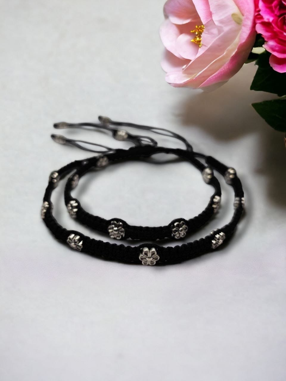 The exquisite thread work on these anklets is meticulously handwoven, creating a beautiful, textured design that complements the soft shine of the German silver. The flower charms are carefully attached to add a feminine and graceful touch, bringing a sense of whimsy and elegance to your style. Whether you’re dressing up for a special event or simply adding flair to your casual wear, these anklets make an ideal accessory.