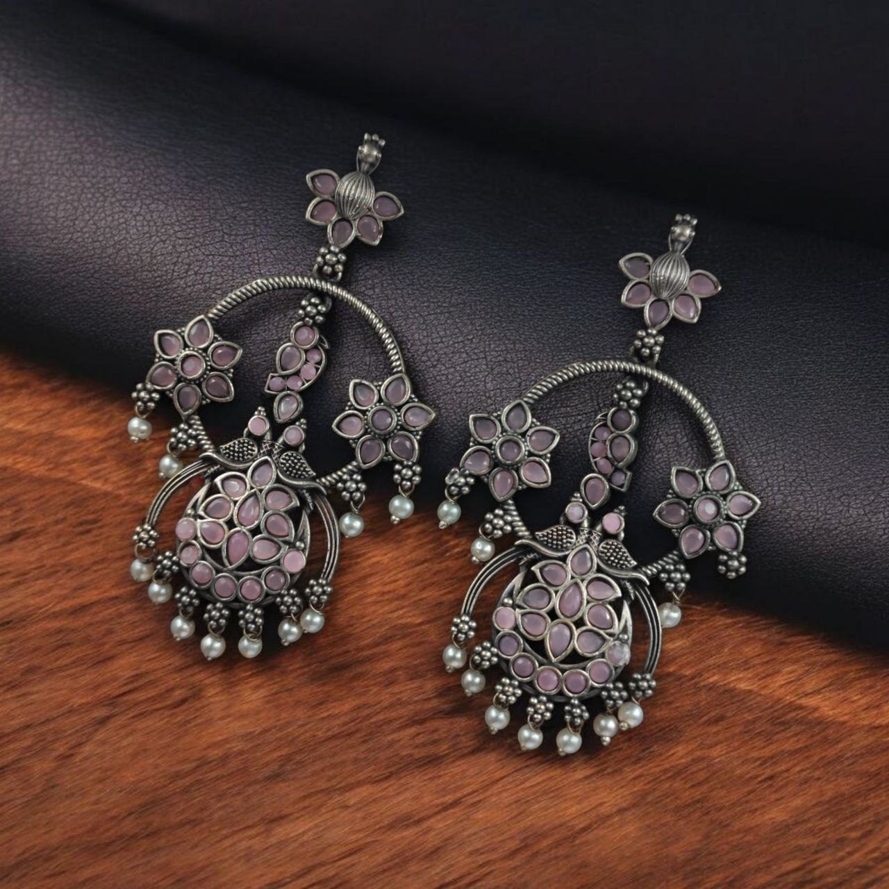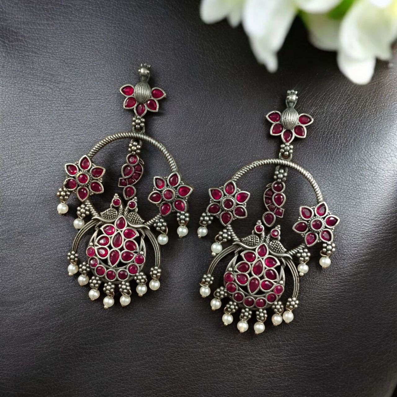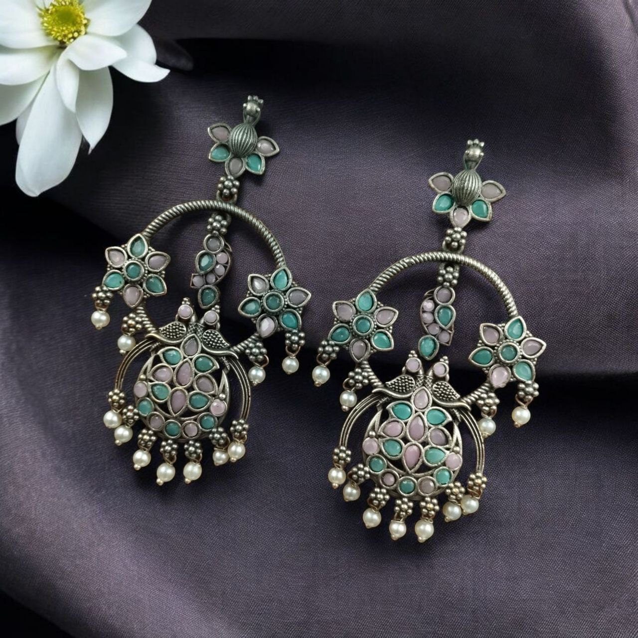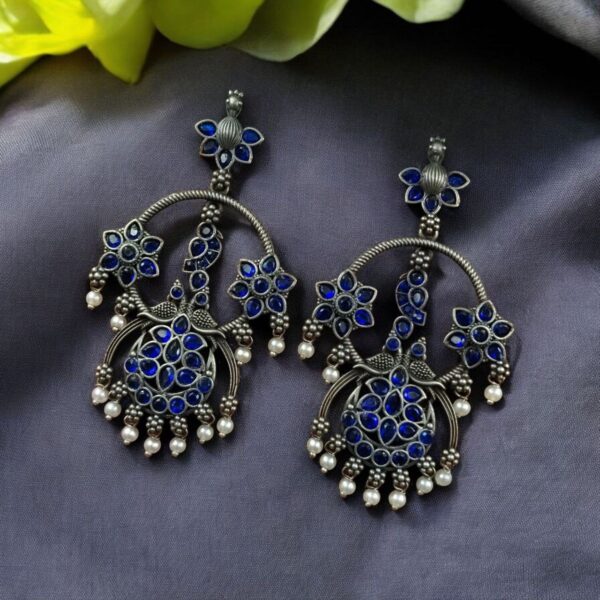 Elevate your ethnic look with our Best Ethnic Peacock Earrings ? Oxidized Stone & Pearl Detailing in Silver Replica Dangler Jewelry. Crafted with intricate detailing and a timeless peacock motif, these earrings are a beautiful representation of traditional elegance blended with artistic craftsmanship.