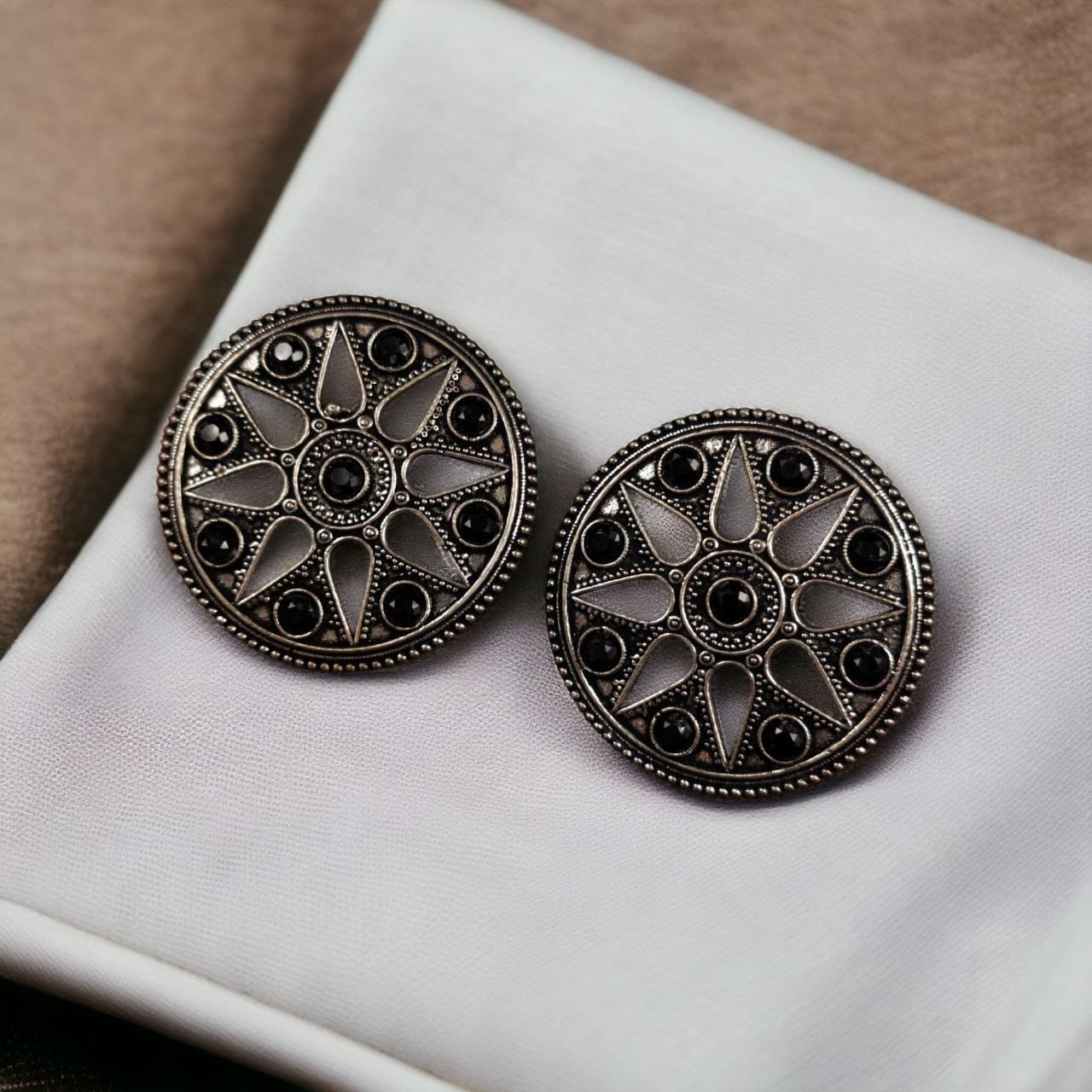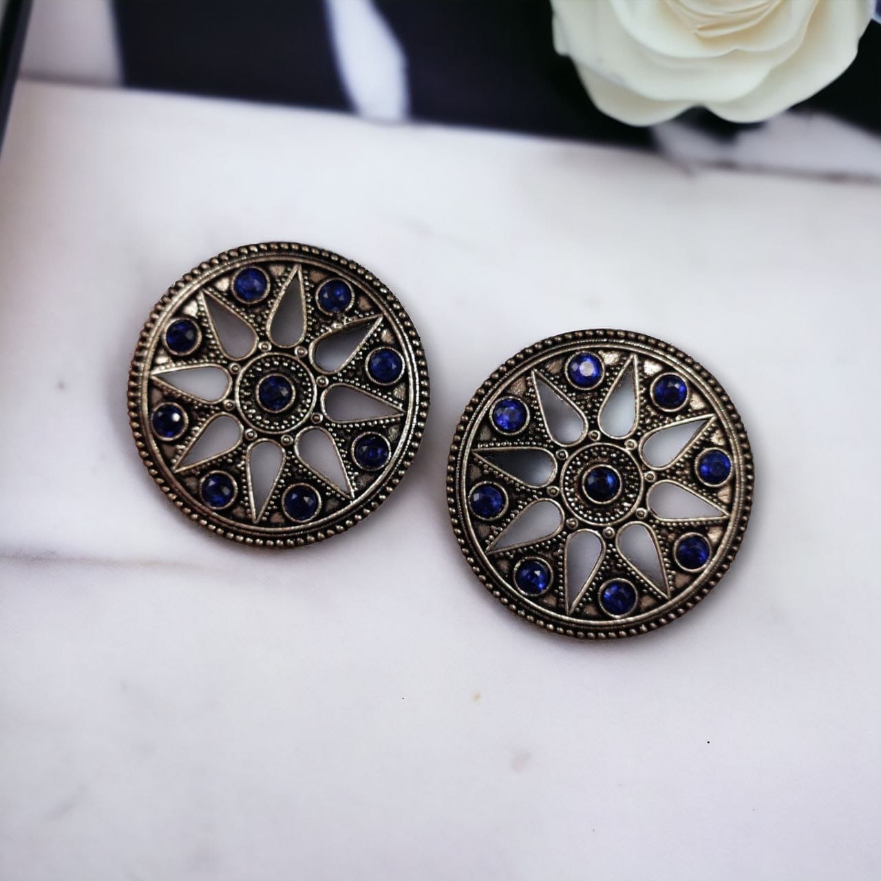 Designed to match a variety of traditional outfits, these round brass earrings pair beautifully with sarees, lehengas, anarkalis, and salwar suits. Their ethnic look makes them ideal for festivals like Diwali, Navratri, Karva Chauth, and weddings, while their subtle elegance allows them to be worn with everyday ethnic attire as well. Whether you?re attending a family gathering or a festive celebration, these stone stud earrings will elevate your style effortlessly.