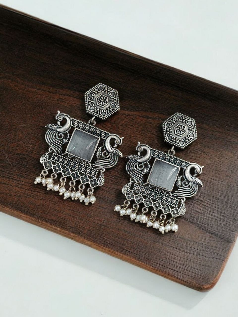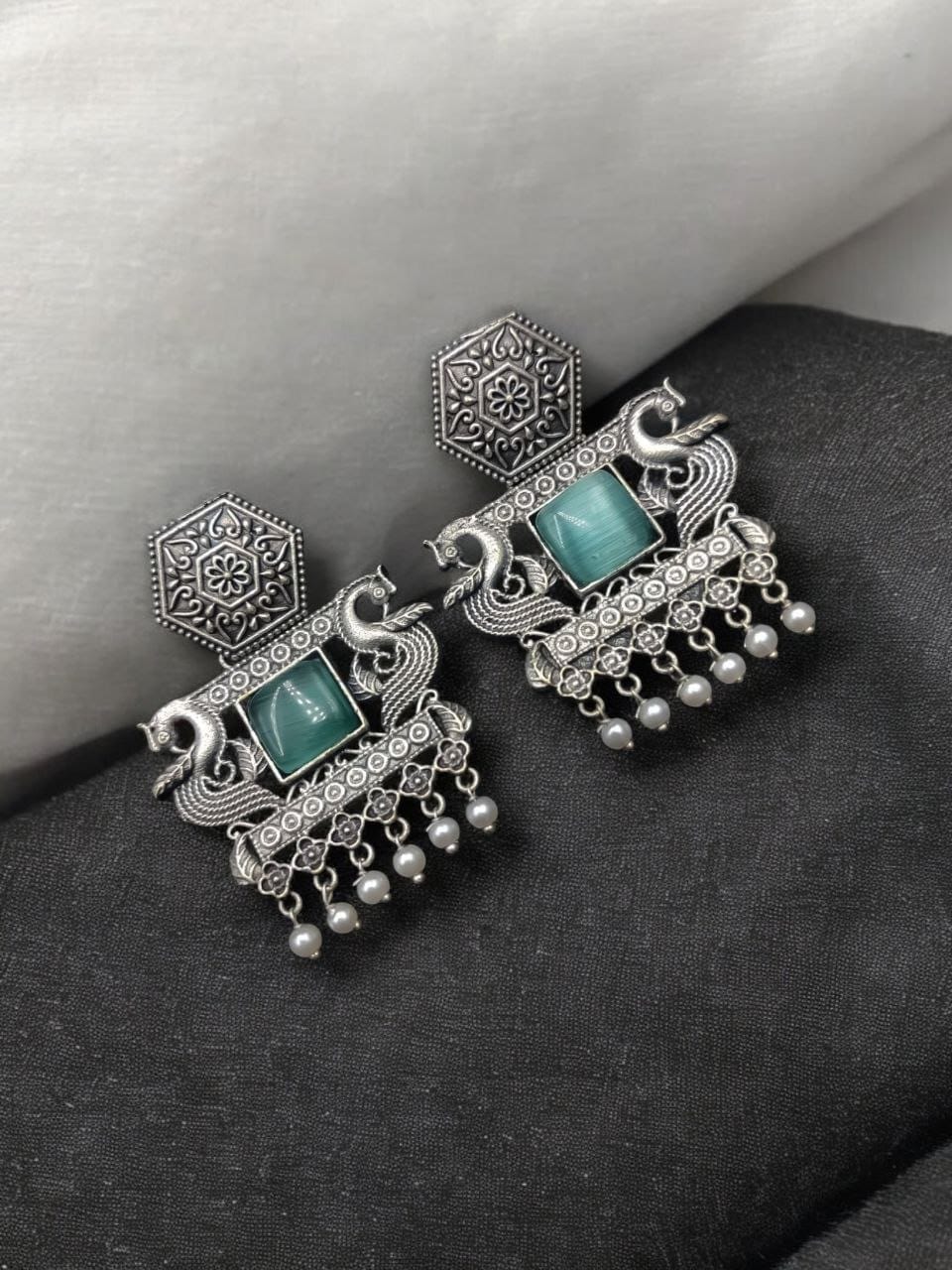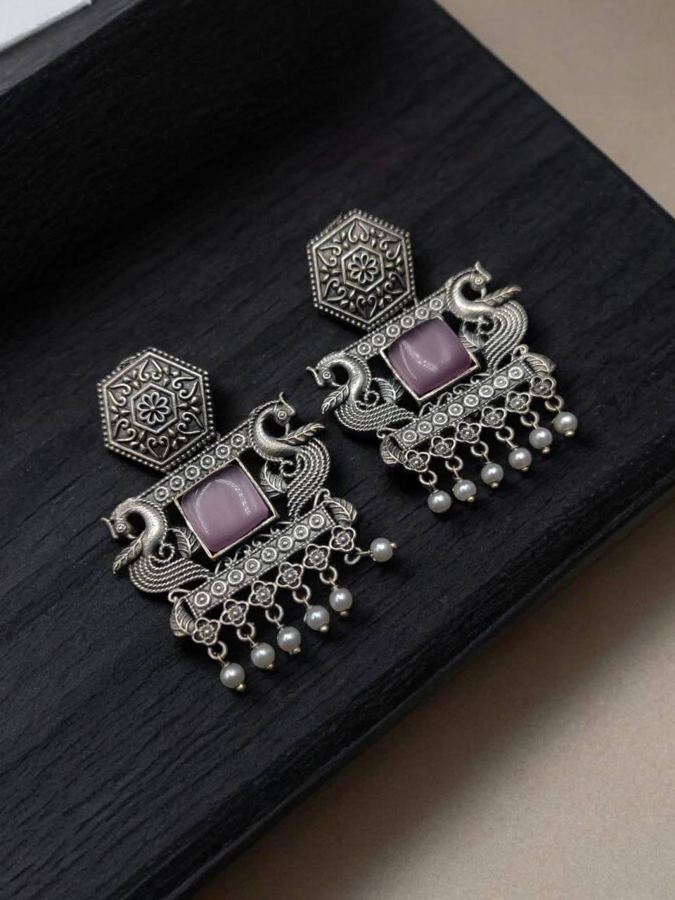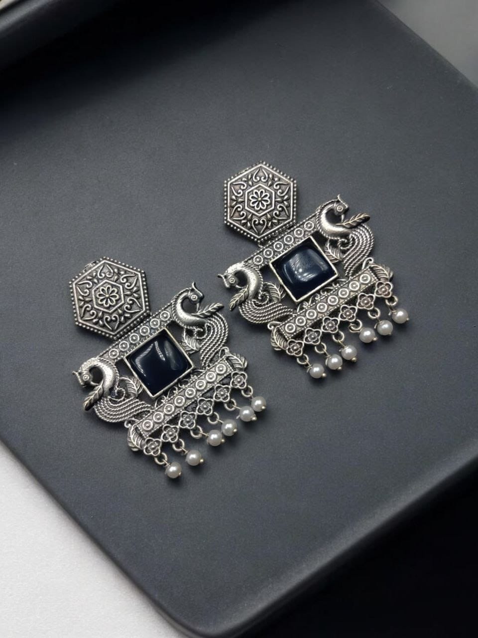 Adding to the allure of these earrings are the delicate pearl beads that hang elegantly from the base. The combination of oxidised silver and soft, white pearls creates a harmonious blend of textures, offering a striking contrast that enhances the overall aesthetic. The pearl danglers sway gracefully with every movement, adding fluidity and grace to your style.