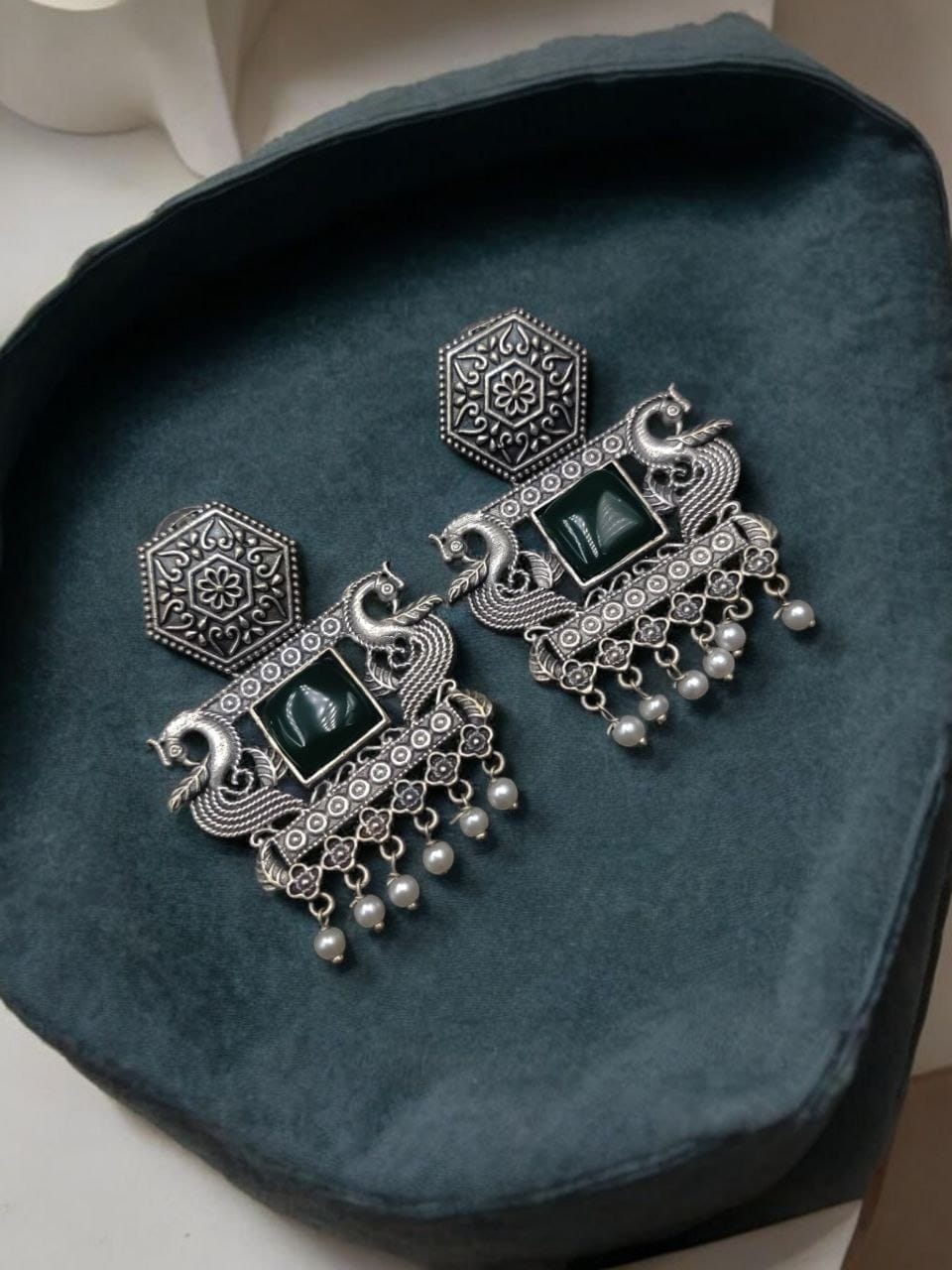 Crafted with a high-quality silver replica finish, these peacock earrings boast an oxidised look that enhances their vintage appeal, making them perfect for anyone who loves antique-inspired accessories. The delicate detailing on the peacock’s feathers showcases fine artistry, bringing out the beauty of traditional Indian designs in a modern context. The oxidised silver material adds a timeless appeal, giving these earrings a rustic yet elegant charm that pairs well with both ethnic and contemporary wear.