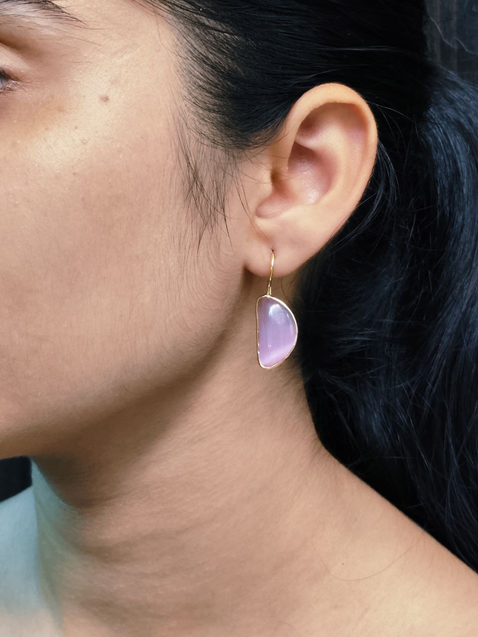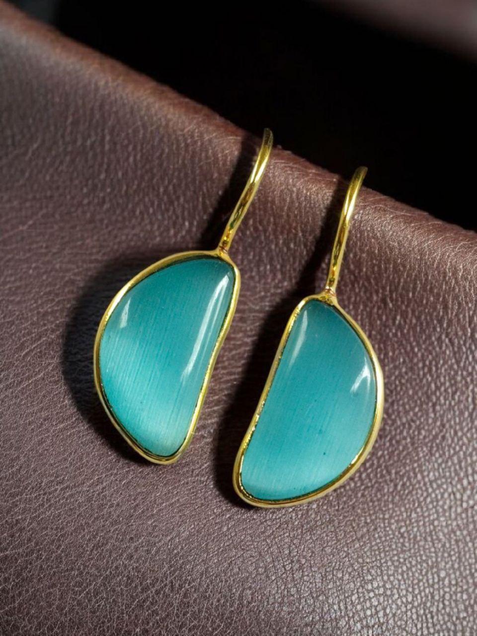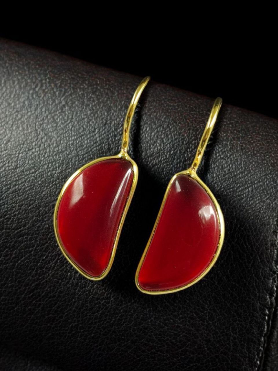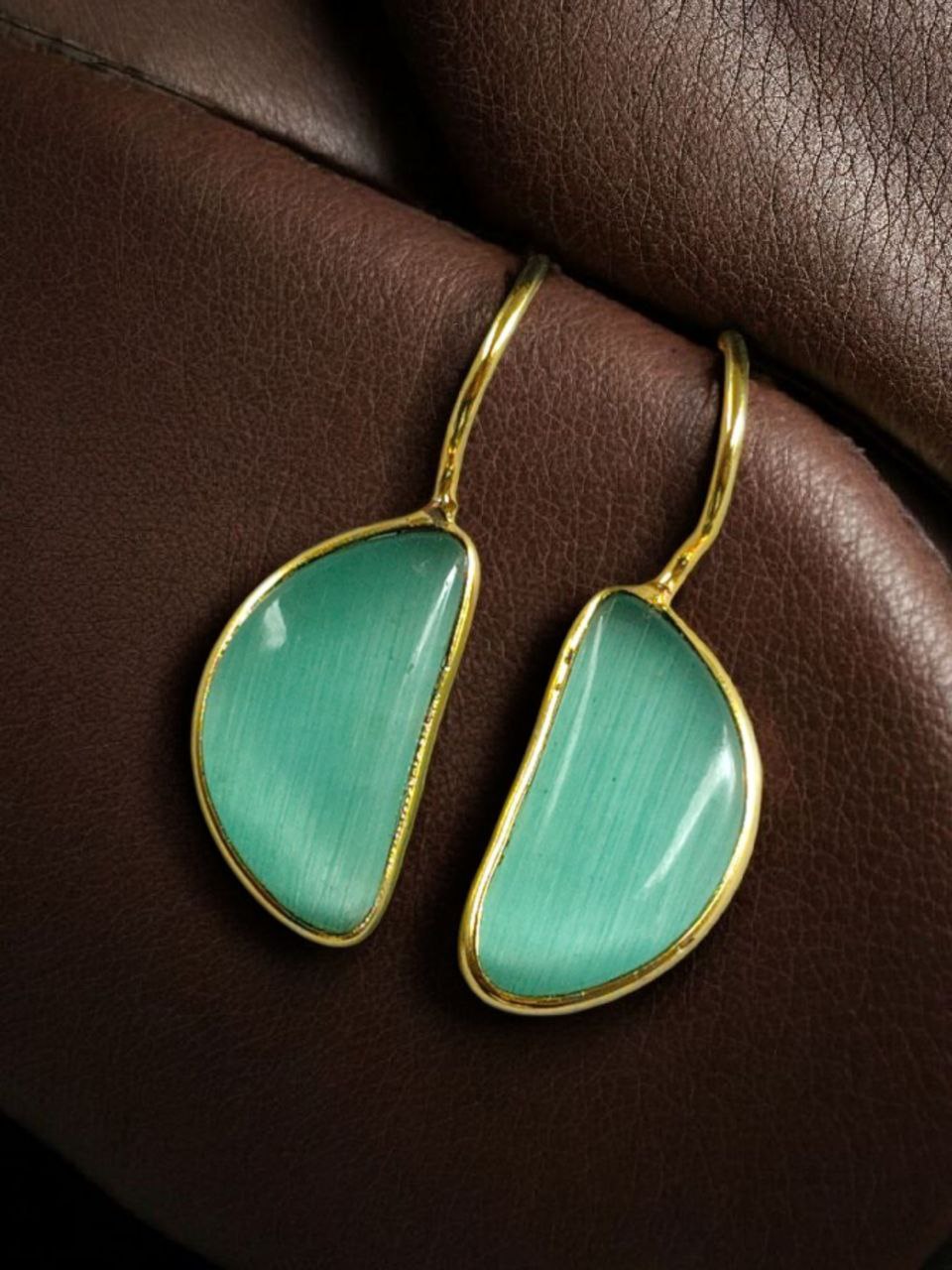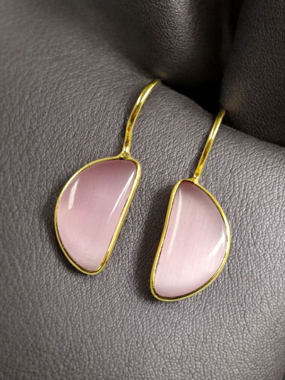 Crafted with a half-circle design, the earrings showcase a unique modern twist while maintaining a touch of traditional charm. The gold-plated finish adds a rich, radiant glow that complements all skin tones, ensuring you stand out effortlessly at any event. At the heart of each earring lies a beautiful Monalisa stone, known for its soft, luminous shades and sophisticated charm. This stone not only enhances the overall look but also adds a subtle, luxurious detail that makes the design truly captivating.