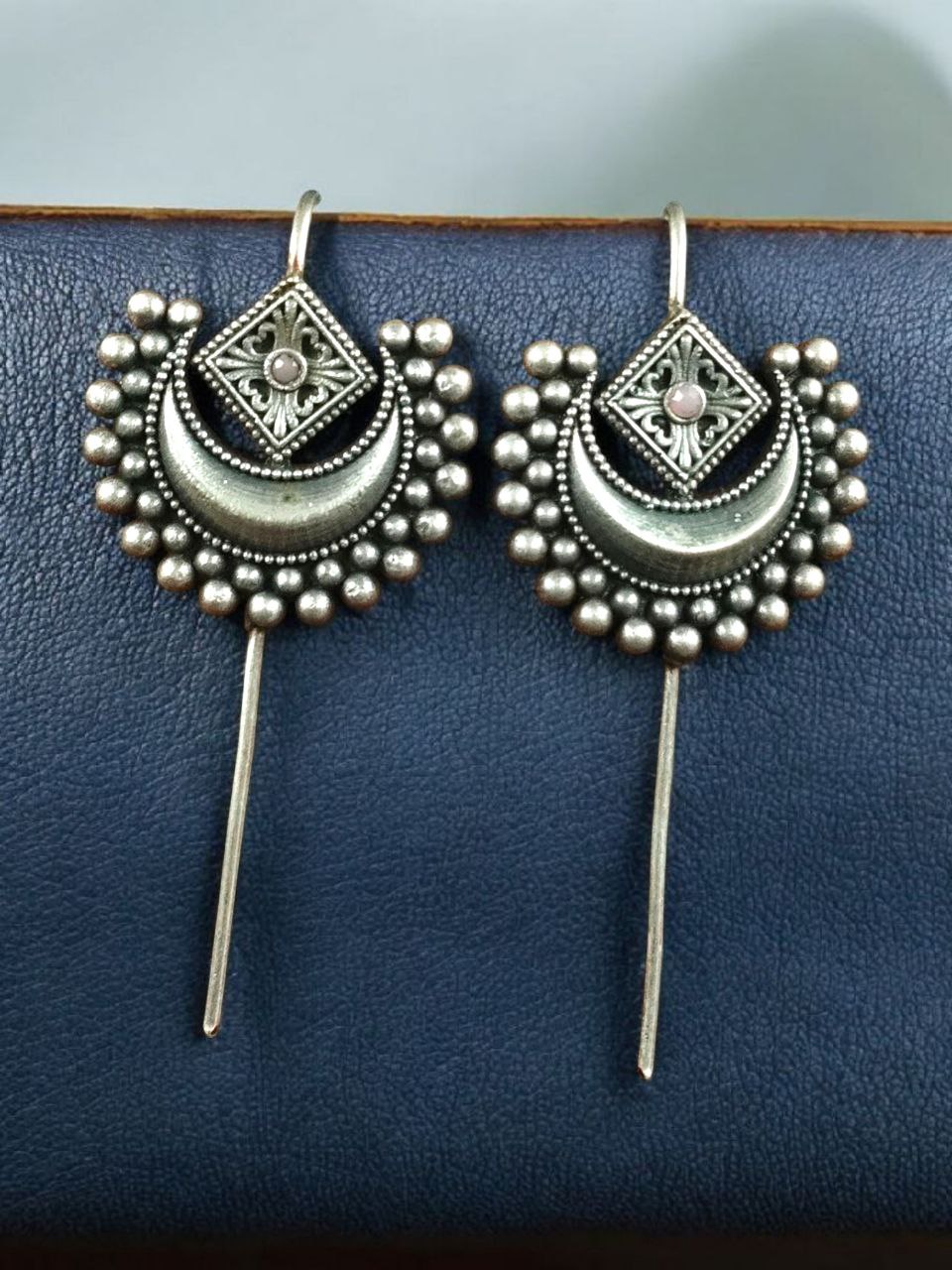 This beautiful earcuff showcases detailed stone work that enhances its overall charm. Each stone is carefully set to add sparkle and depth, while the oxidized finish gives it a rustic, handcrafted feel. The silver tone beautifully complements Indian as well as western outfits, offering unmatched versatility for every occasion. Whether you?re attending a festive celebration, wedding, or casual gathering, this Half Moon Oxidized Earcuff will elevate your ensemble with elegance and sophistication.