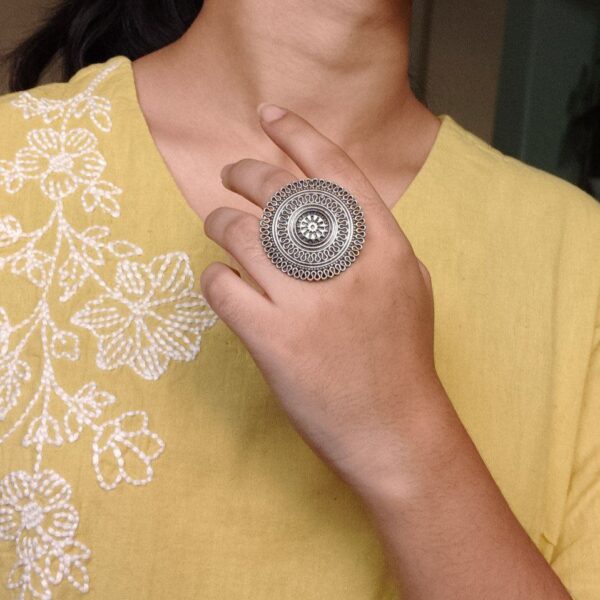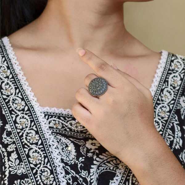 The ring features a finely detailed artistic pattern inspired by ethnic Indian jewelry designs. The oxidized texture adds depth and character, making it a statement accessory without being overly bold. Its adjustable band ensures a perfect and comfortable fit for all finger sizes, making it easy to wear throughout the day without any irritation or tightness.