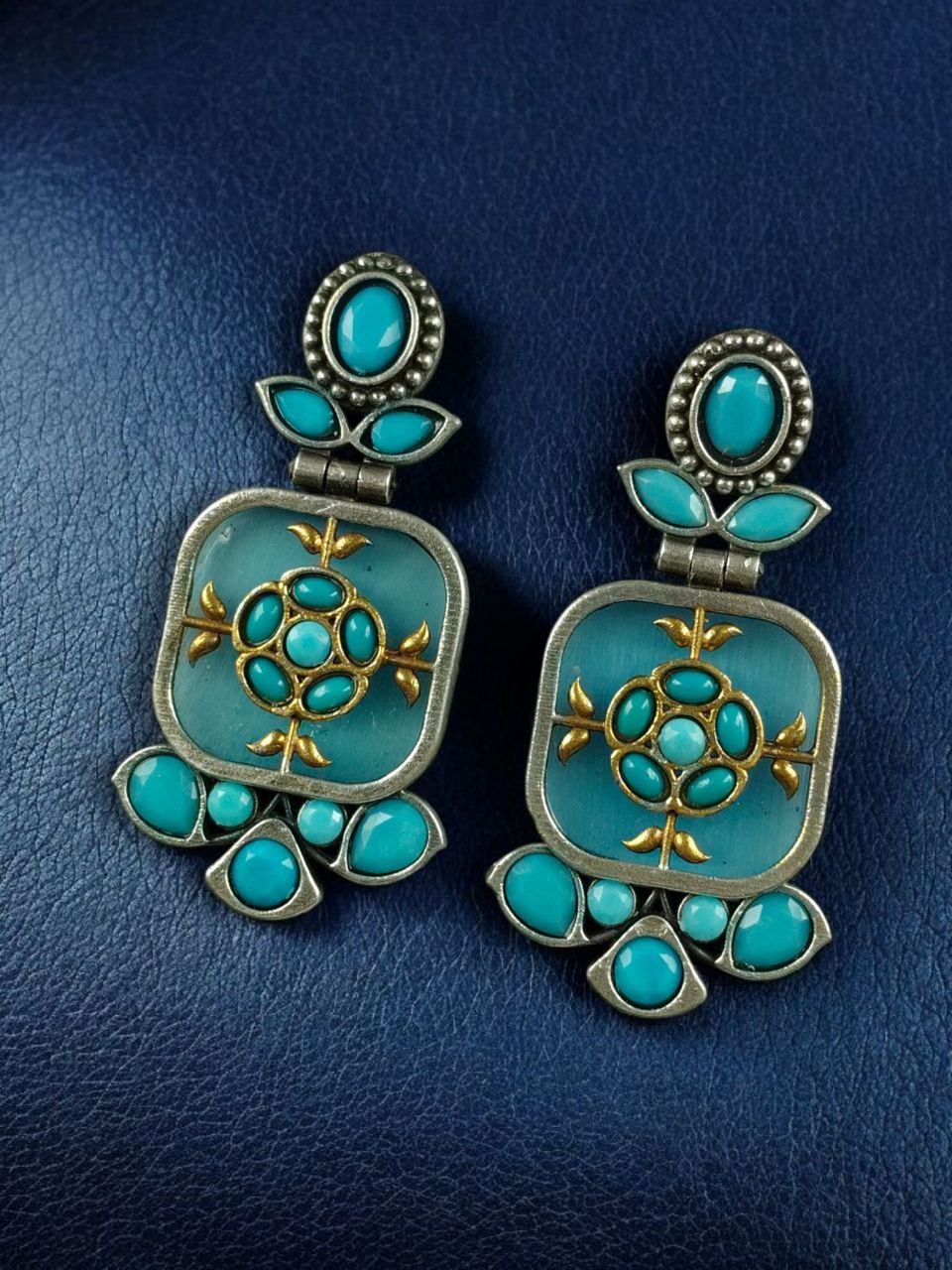The two-tone oxidized effect blends beautifully with the shimmering silver replica plating, creating a rich antique appeal with a contemporary twist. The highlight of these earrings is the gorgeous Monalisa stone, known for its captivating shine and timeless beauty. Its soft glow enhances the entire design and adds a luxurious touch, making these dangler earrings perfect for both festive occasions and everyday glamour.
