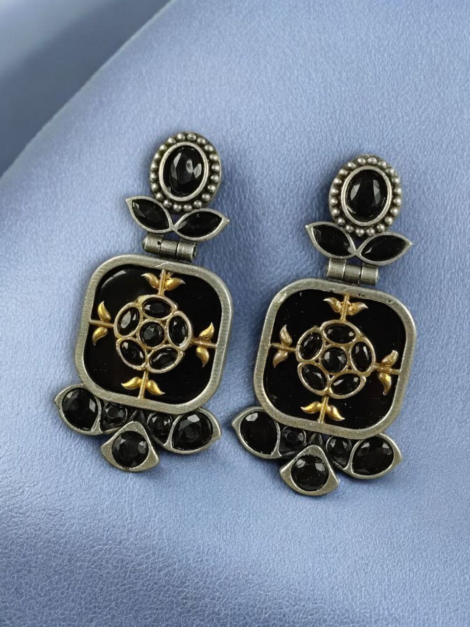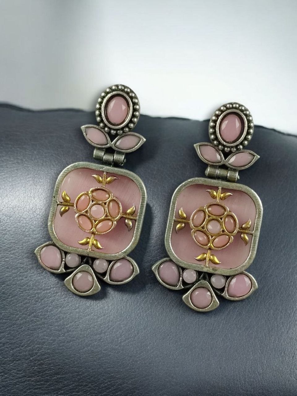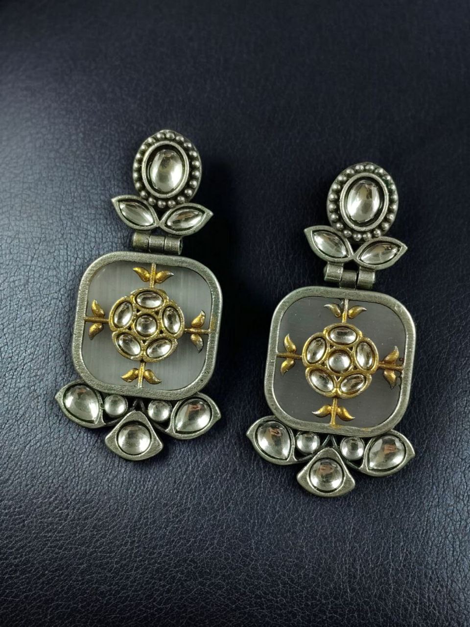 Elevate your jewelry collection with our Designer Two-Tone Oxidized Earrings | Monalisa Stone Dangler Silver Replica Best Trendy Jewelry, a stunning fusion of modern elegance and traditional charm. Crafted for women who love statement accessories, these earrings are designed to draw attention with their unique two-tone finish and premium Monalisa stone detailing.
