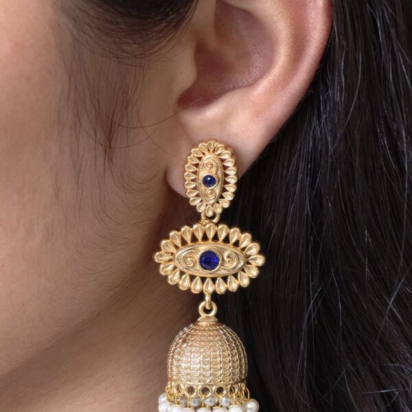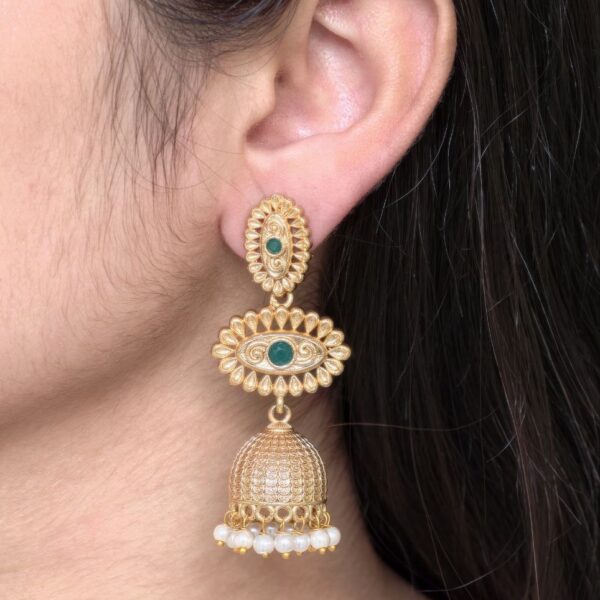These gold plated jhumka dangler earrings pair beautifully with sarees, lehengas, anarkalis, and ethnic suits. Whether styled with a bridal outfit or a simple festive ensemble, they instantly elevate your look with a royal and traditional touch. Their versatile design also makes them suitable for parties and special family gatherings.