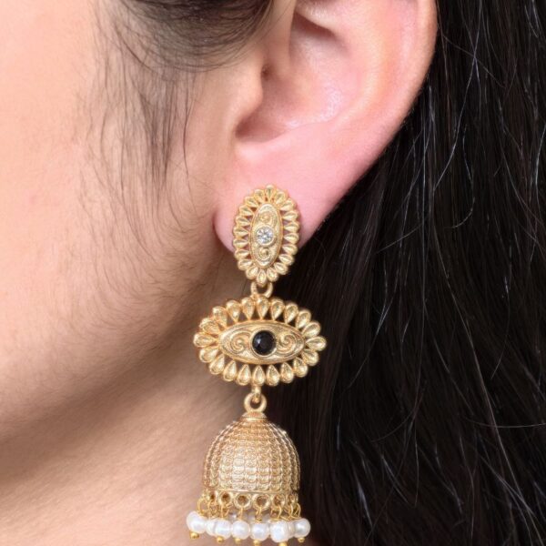 Designed for women who appreciate traditional jewelry with artistic detailing, these Jhumka Dangler Earrings blend heritage-inspired design with modern durability. The gold plated finish helps resist fading when properly cared for, while the stone and pearl accents enhance their elegance and charm. Their classic design ensures they remain fashionable across seasons and trends.