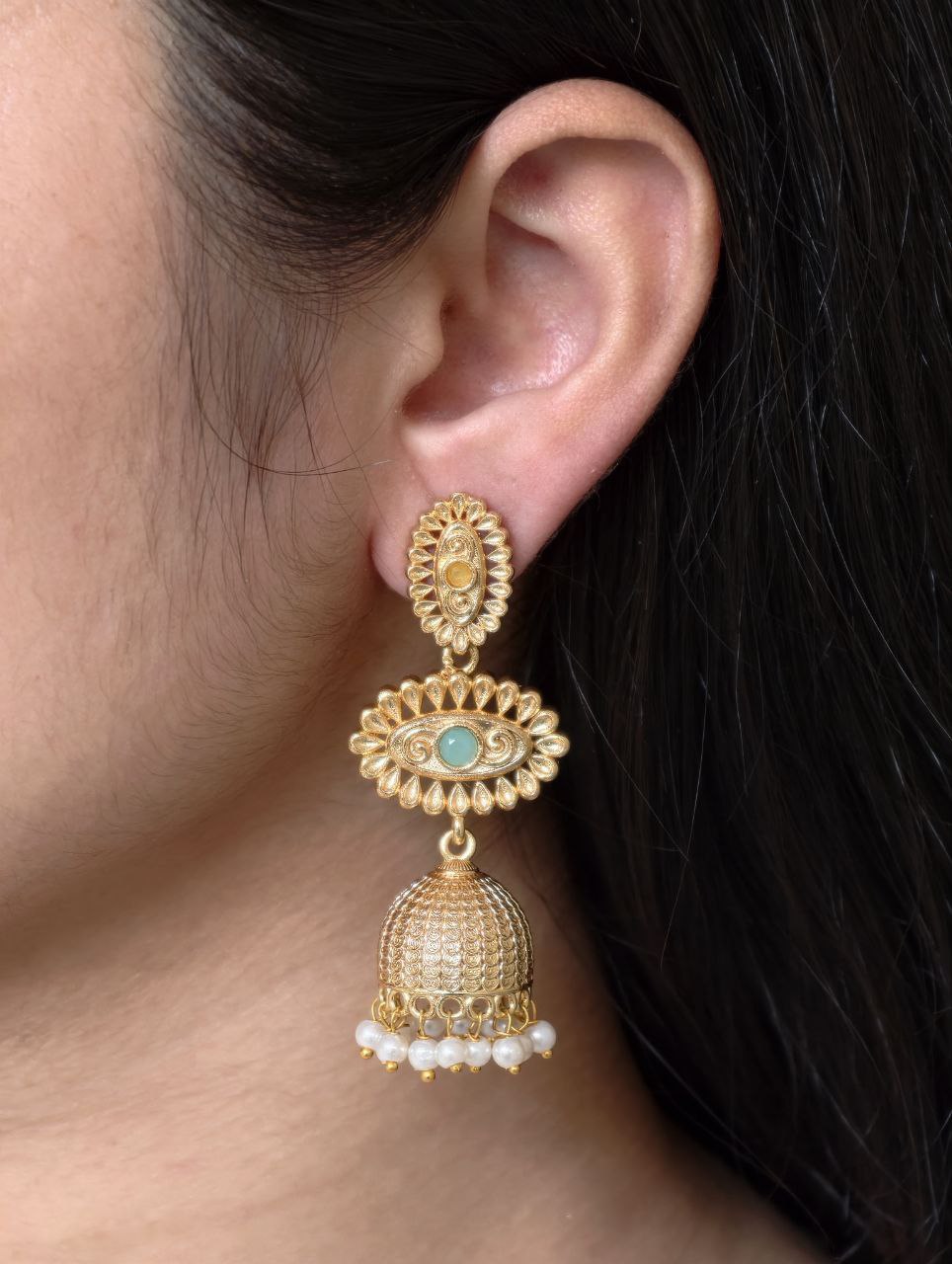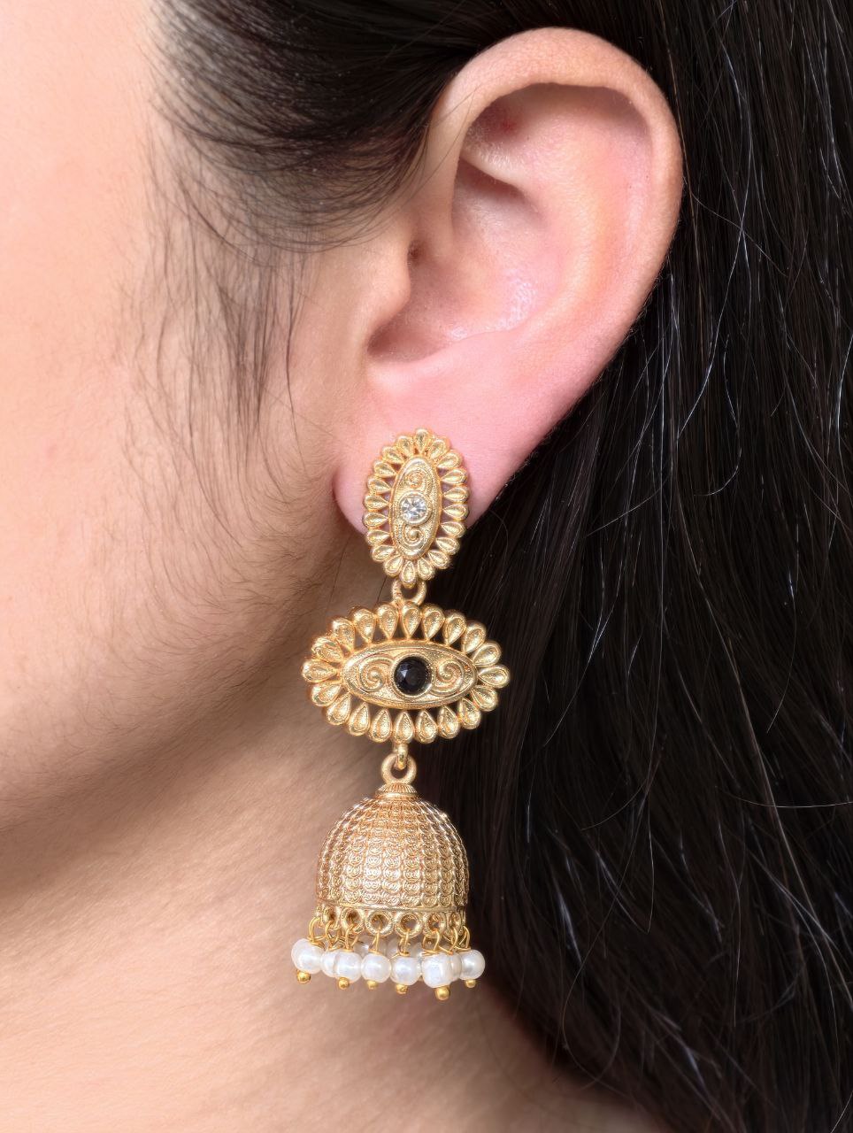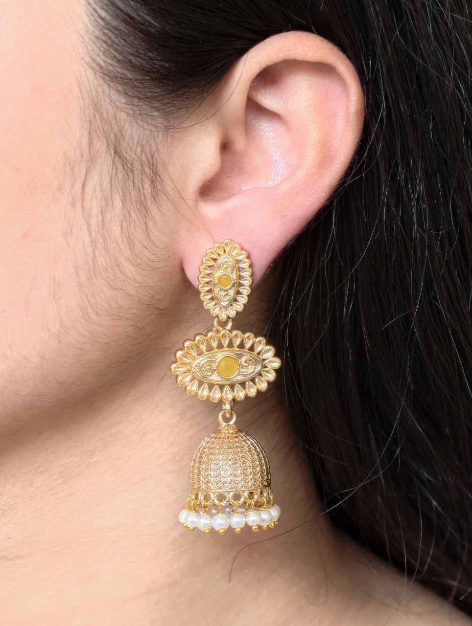 Crafted from high-quality base metal, these Jhumka Dangler Earrings feature premium gold plating that offers a rich shine and long-lasting durability. The traditional jhumka silhouette is adorned with carefully placed stones that add a subtle sparkle, while the delicate pearl work brings a soft and elegant charm to the overall design. Every detail reflects fine craftsmanship, giving these earrings a luxurious and refined appearance.