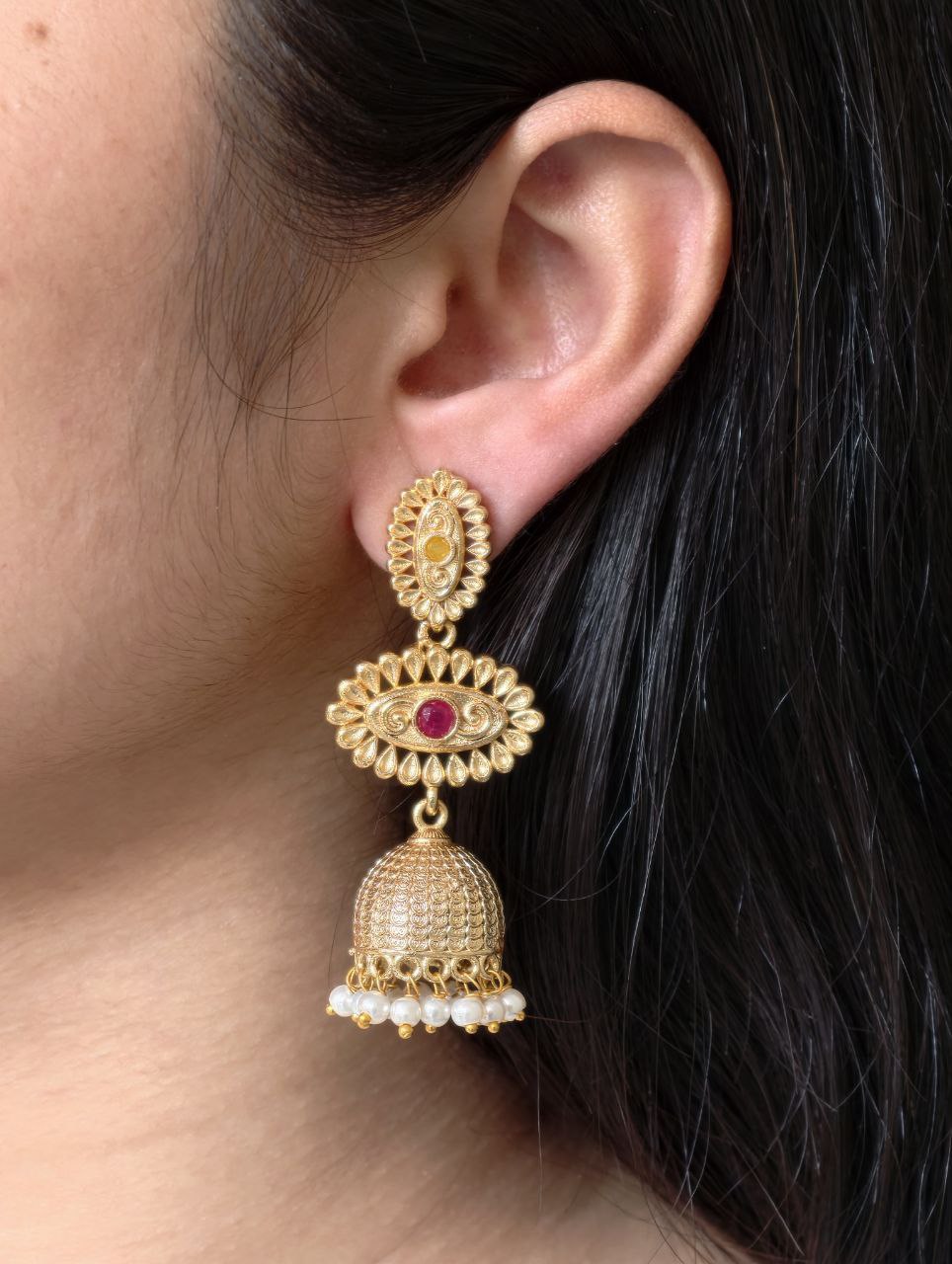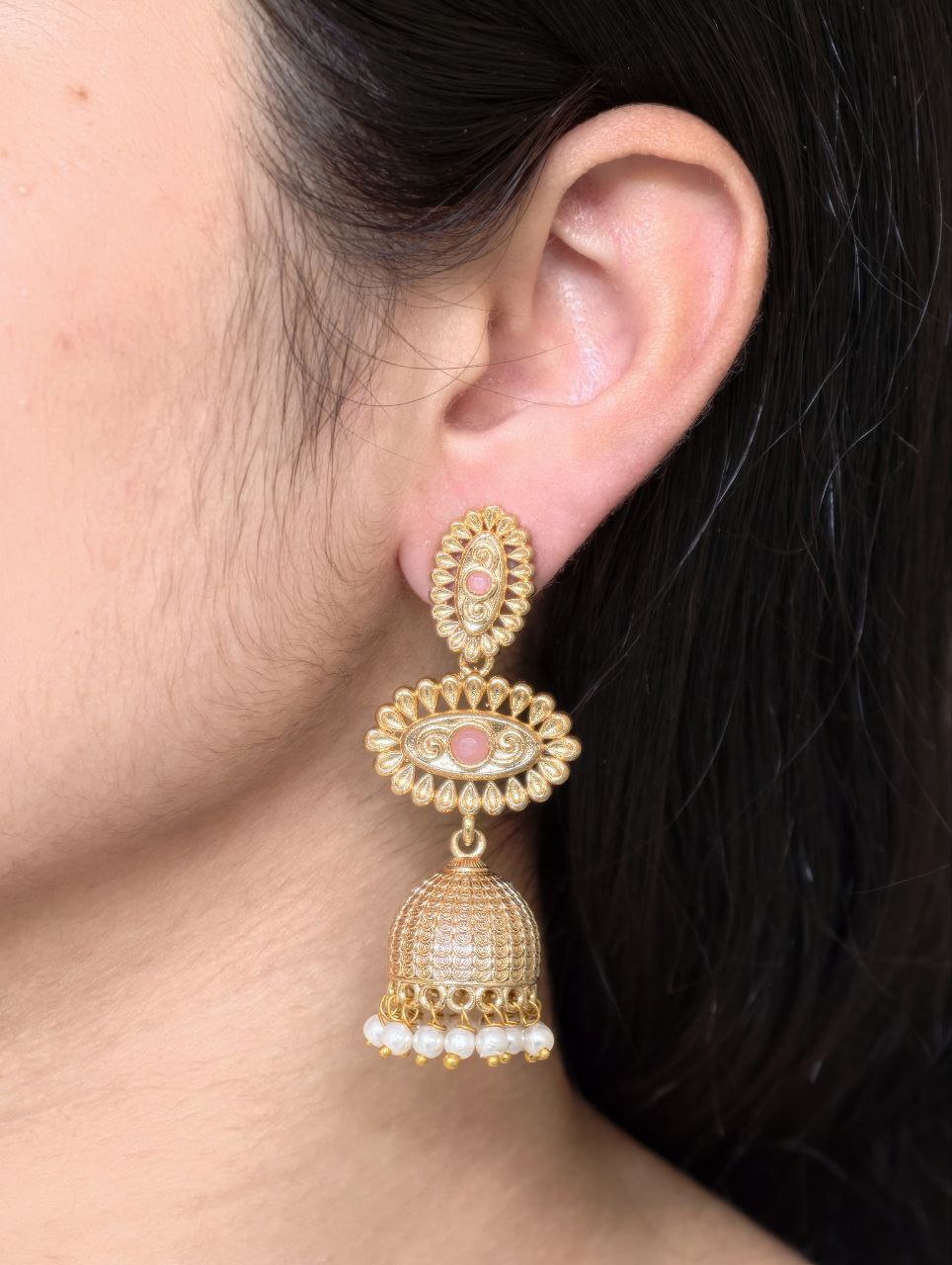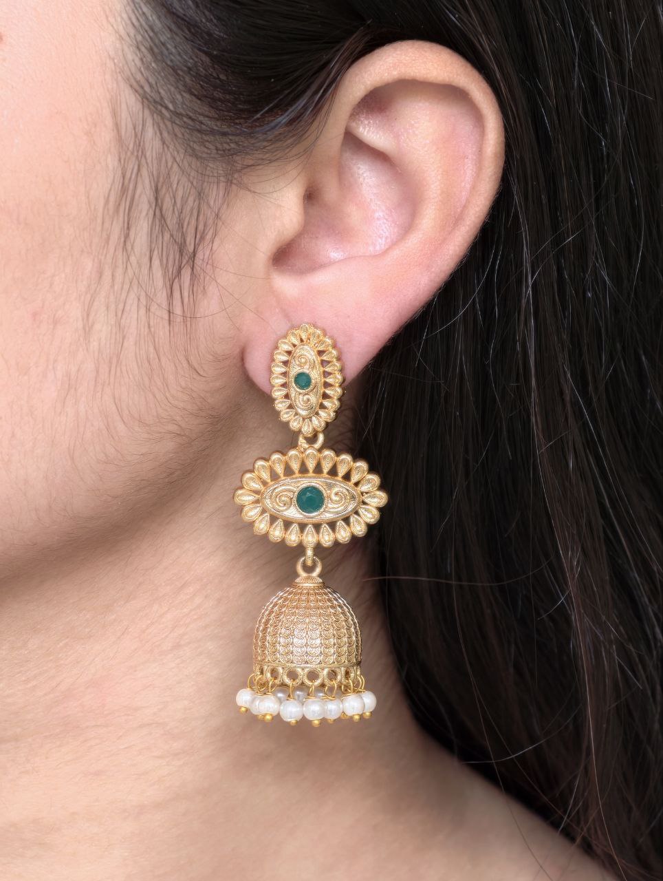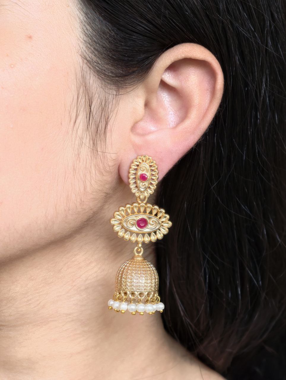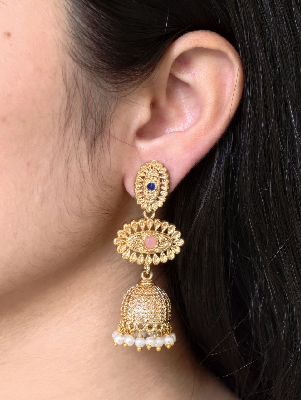 The dangler style adds graceful movement, making these Jhumka Dangler Earrings ideal for weddings, festive occasions, and cultural celebrations. Despite their rich and ornate look, these earrings are lightweight and comfortable, allowing you to wear them for long hours without discomfort. The secure closure ensures a perfect fit, so you can enjoy both style and confidence throughout the day.
