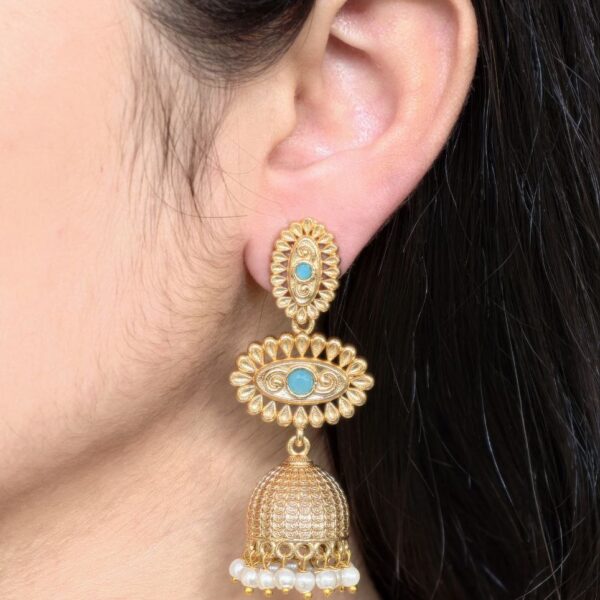 The graceful leaf pattern symbolizes growth, beauty, and natural elegance, making these earrings more than just an accessory. They represent artistic craftsmanship and traditional jewelry heritage. Whether you are looking to elevate your festive look or searching for a thoughtful jewelry gift, the Leaf Design Jhumka is a perfect choice. With its elegant design, durable material, and timeless appeal, it becomes a must-have piece for every ethnic jewelry lover.