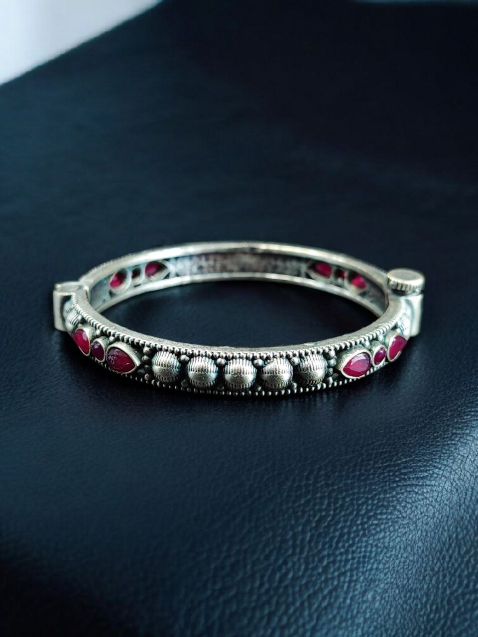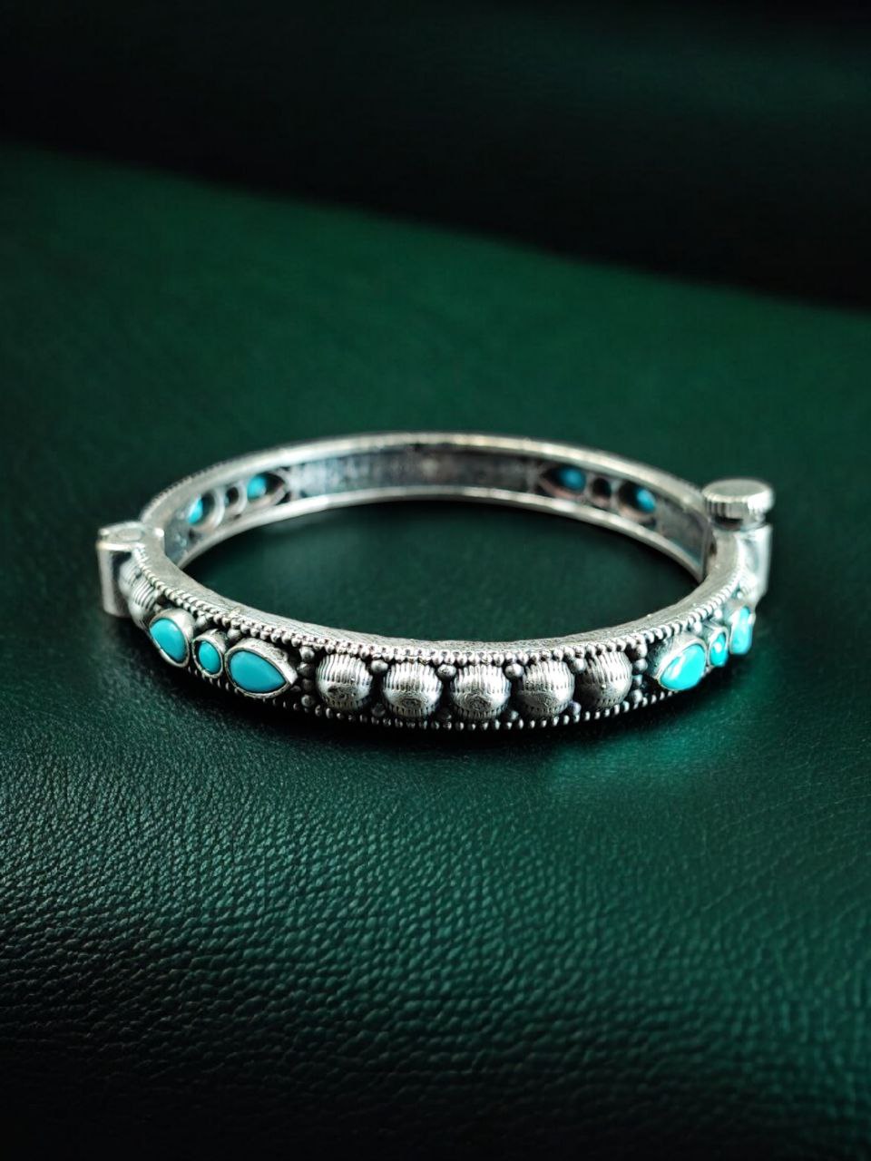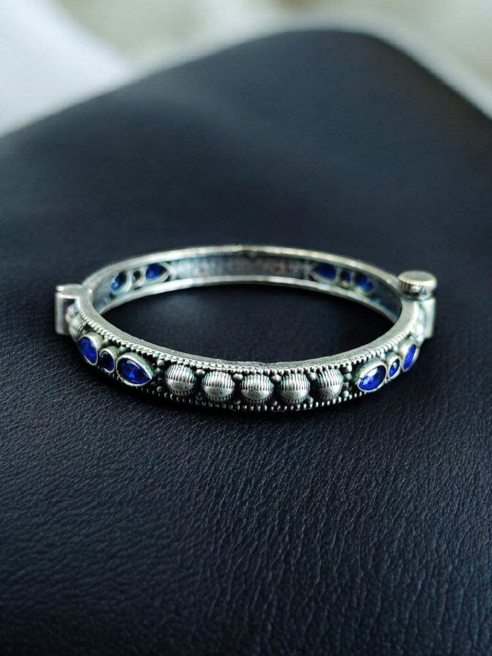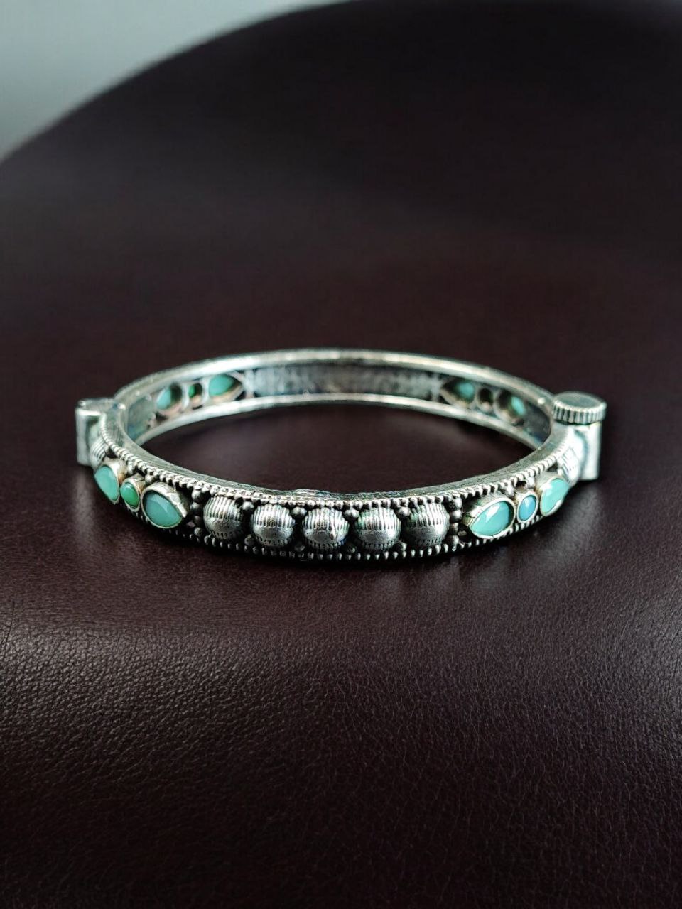 Crafted in a premium silver replica base, this openable bangle showcases fine stone work that adds subtle sparkle without overpowering its traditional appeal. The oxidized finish gives the bangle a rich, vintage character, making it suitable for both festive occasions and everyday ethnic wear. Each stone is carefully placed to maintain balance and symmetry, reflecting skilled craftsmanship and attention to detail.