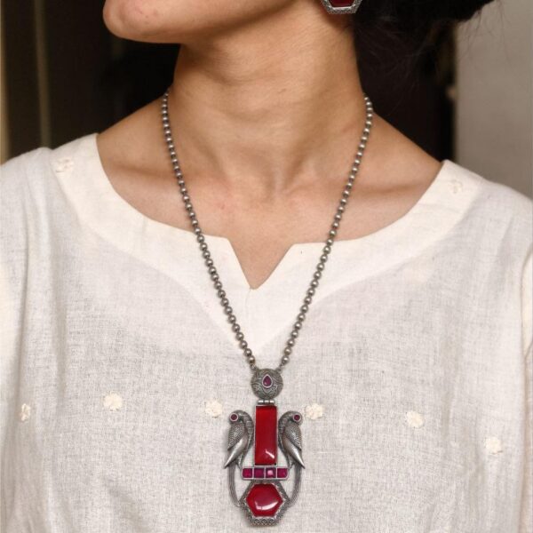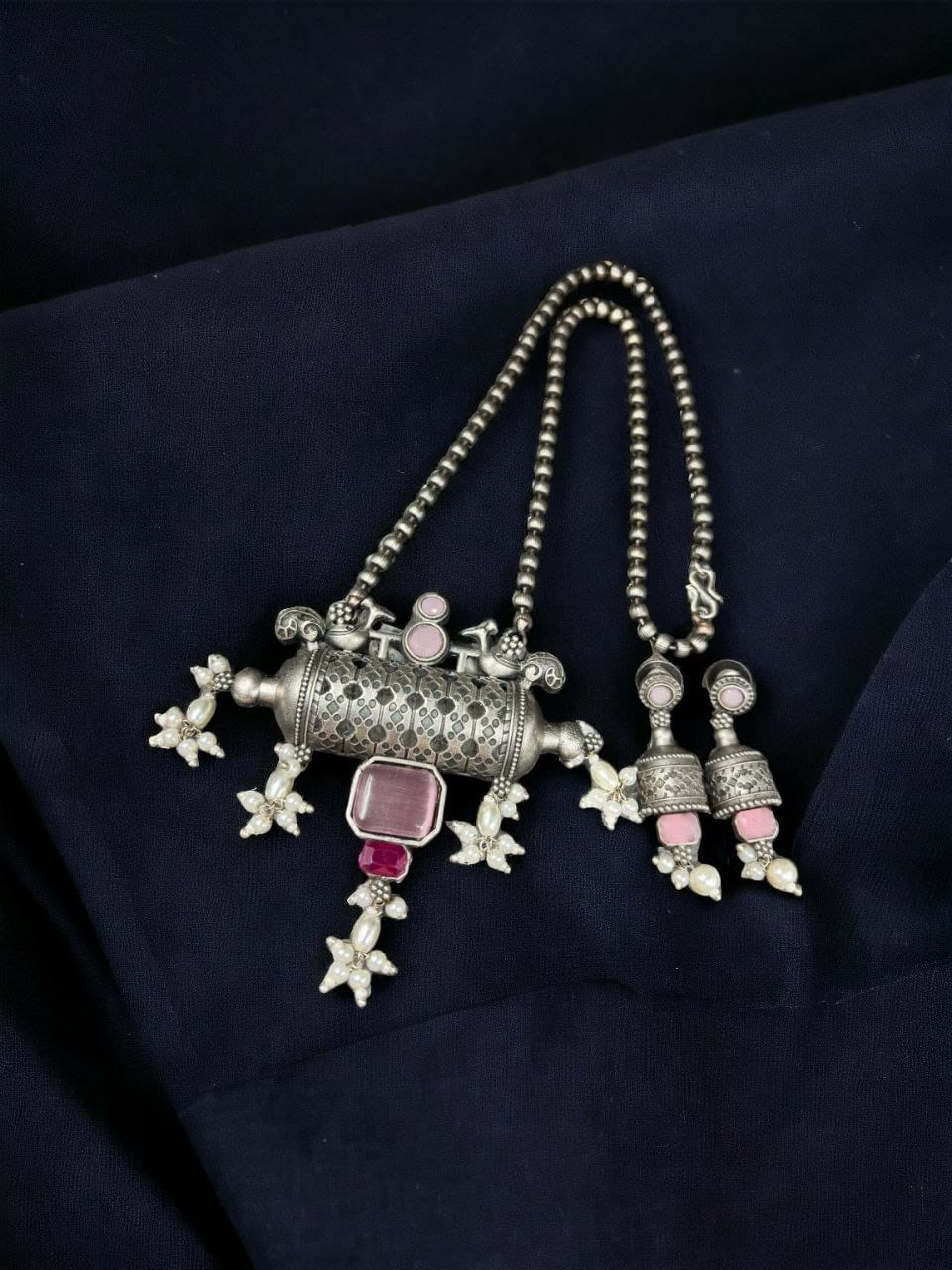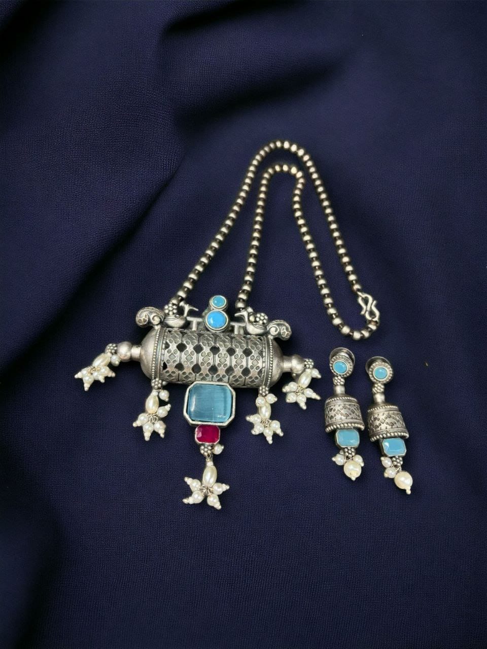 This Ethnic Brass Necklace with Monalisa Stone and Bird Motif is a perfect gift for your loved ones or a special treat for yourself. Its elegant design, combined with the stunning stone and matching earrings, makes it an essential addition to any jewelry collection.
